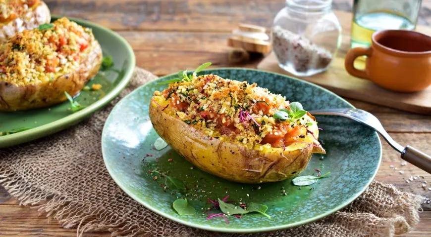 Išskobtas bulves prikimškite įdaro, pabarstykite skrudintais duonos trupiniais. Jeigu įdaro liks, galite uždėti ant nupjaustytų bulvių. Tada grąžinkite į orkaitę 10 minučių.