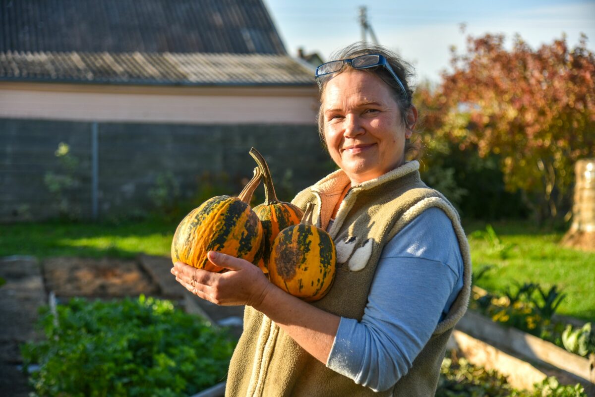 Pailgi, apvalūs, žali, geltoni ir balti – kelios eilės skirtingų moliūgų neseniai iš daržo persikraustė į Galinos namų mansardą. Čia tvarkingai ir sausai sudėtos daržovės stovės iki kito rudens.