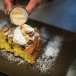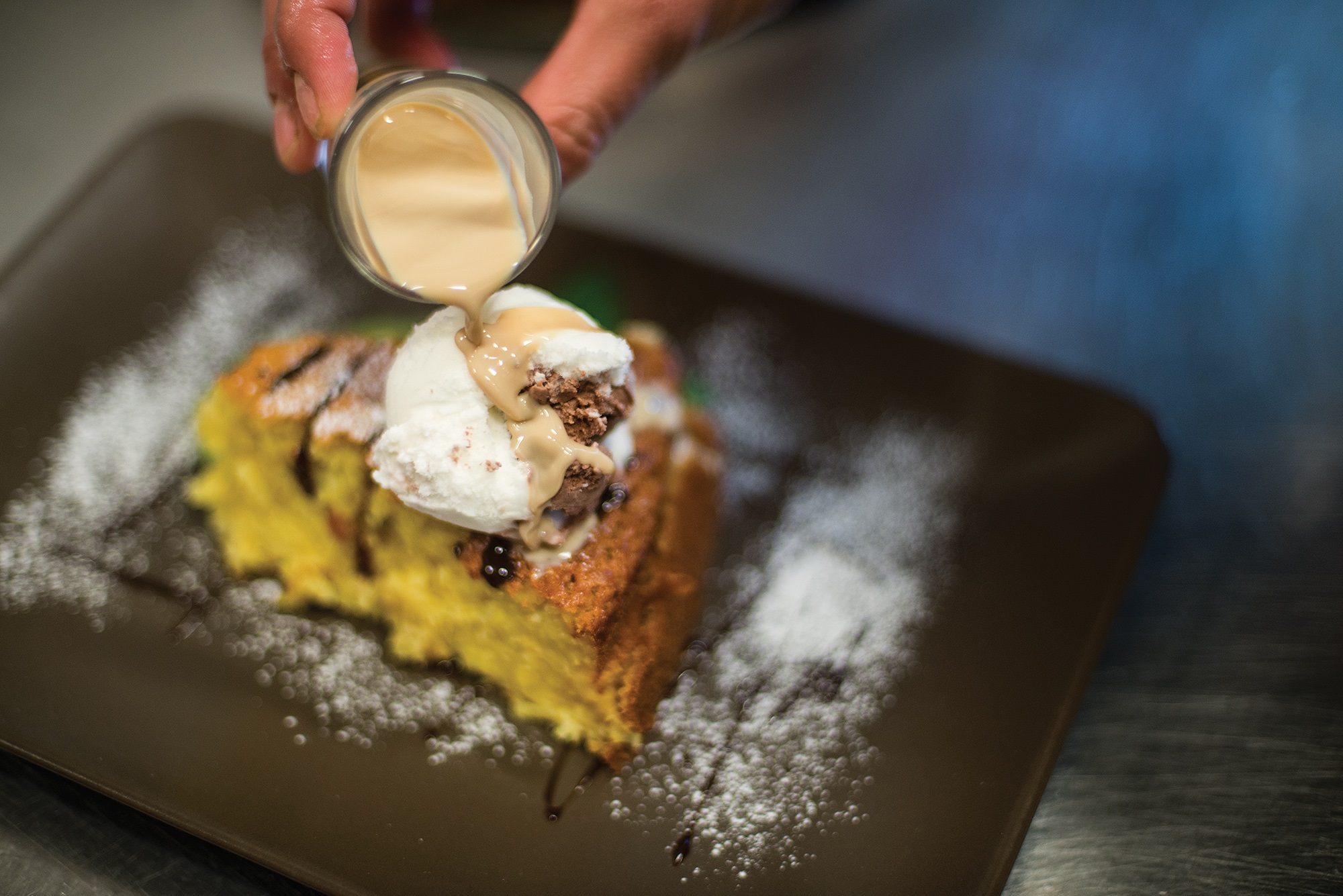Atvėsintas pyragas restorane patiekiamas su vaniliniais ledais ir šlakeliu likerio „Bailey’s“.