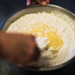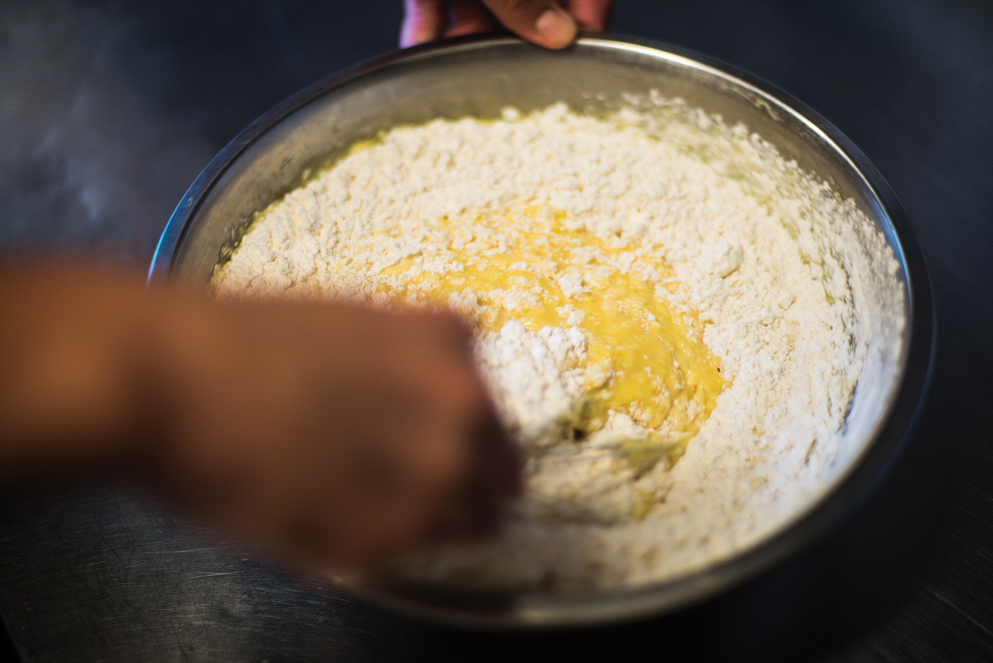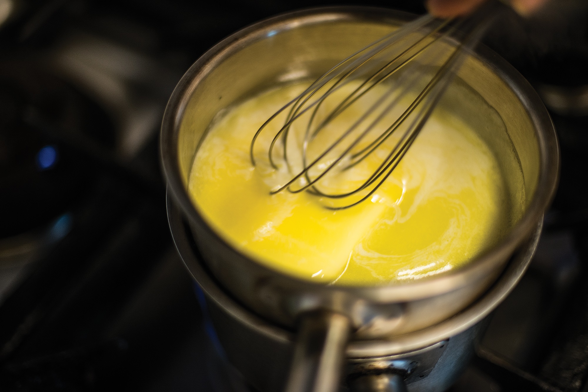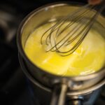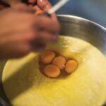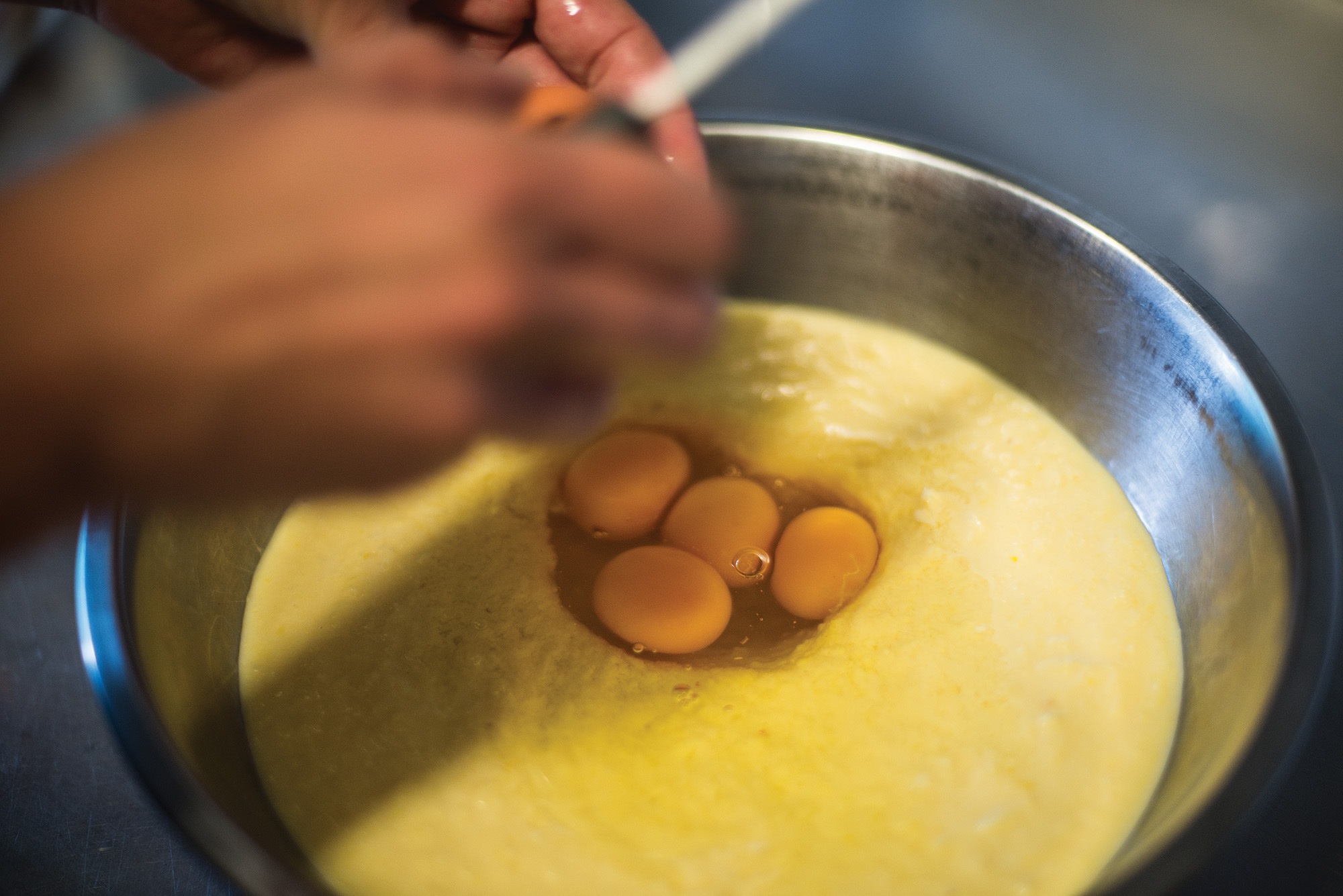 Vėl grąžinkite puodą ant ugnies ir pašildykite. Kitame inde sumaišykite grietinėlę ir trynius. Nuolat maišydami trynių ir grietinėlės masę dalimis supilkite į užkaitintą pieno ir kukurūzų masę.