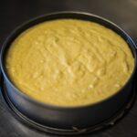 Skardą išklokite kepimo popieriumi ir ištepkite sviestu. Pyrago tešlą pilkite į skardą ir kepkite 150 laipsnių temperatūroje valandą.