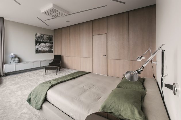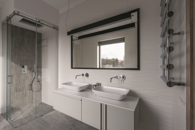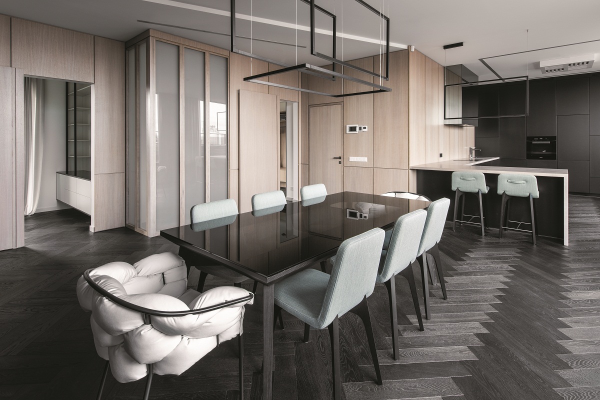 156 m² moderniame būste dominuoja klasikinės baltos ir inovatyvios juodos spalvos atspalviai, šviesaus ir tamsaus medžio detalės. „Raginu lietuvius nebijoti juodos. Daugelis įsitikinę, kad ši spalva depresyvi, bet ji gali veikti kaip jungiamoji detalių grandis ir praplėsti erdvę“, – pastebi V. Tubelytė.