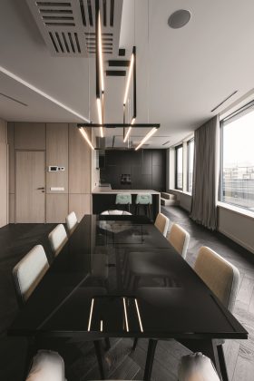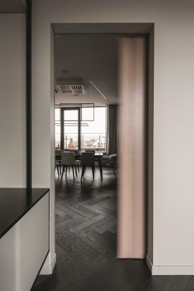 Vientisa penthauzo erdvė gali būti skiriama į dvi dalis – gyvenamąją, kurioje vyksta veiksmas, sutinkami ir vaišinami svečiai, ir ramesnę, skirtą keturių asmenų šeimos ir svečių poilsiui. Gyvenamoji erdvė sudaryta iš virtuvės, sujungtos su valgomuoju, ir svetainės, o ramiojoje įkurtas miegamasis, svečių ir darbo kambarys, dvi drabužinės ir vonia su tualetu. Stumdomosios durys ir korpusiniai baldai leidžia šį atskyrimą įgyvendinti praktiškai – užstumiamas įėjimas virsta siena, regis, sukuriančia dvi skirtingas erdves viename bute. Daiktai, reikalingi ne kasdieniam naudojimui, telpa į korpusines spintas, todėl butas atrodo tvarkingas ir neperkrautas.