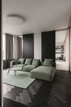 Spalvų trio papildo ir jam gyvybės suteikia pasteliniai žali tonai. „Toks ir buvo tikslas. Kai už lango matai kone visą miestą, nenori šio vaizdo užgožti įmantriomis interjero detalėmis. Tada stengiesi, kad vidaus aplinka vaizdą pratęstų ir papildytų, su juo nekonkuruodama, – pasidomėjus akį nerėžiančių spalvų pasirinkimu paaiškina „Redeco“ interjero dizainerė. – Vis dėlto jei turėtume tik medį, juodą ir baltą, būtų nuobodu. Nusprendėme įpinti žalumos ir žaisti su medžiagiškumu – grublėtumu, švelnumu, šiurkštumu, minkštumu, tvirtumu.“