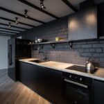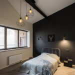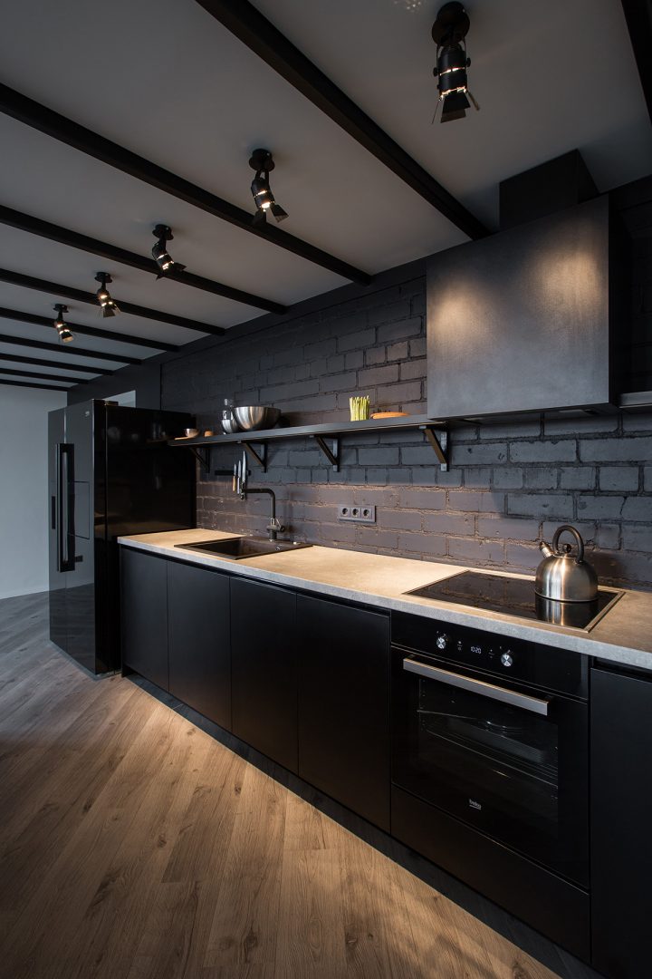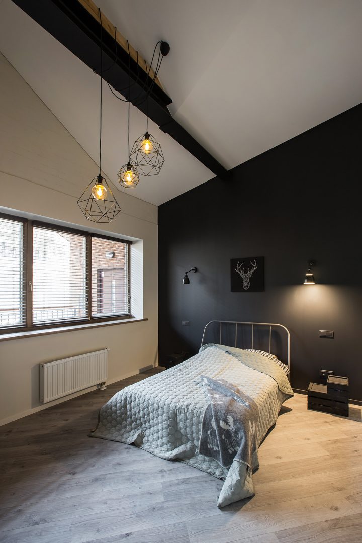 Viena iš pagrindinių interjero spalvų – juoda. Nors ji optiškai sumažina erdvę, tačiau, dizainerio nuomone, ir koncentruoja, suteikia daugiau prietemos ir jaukumo. Juoda čia ne tik virtuvė, bet ir miegamojo siena, vonios kambarys, durys, jungikliai, rankenėlės bei kitos smulkios detalės.