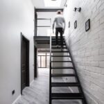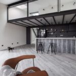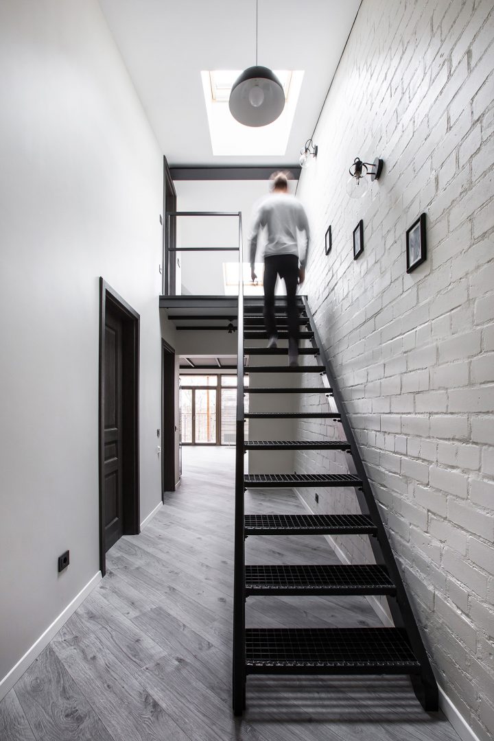 Pirmame aukšte suprojektuota bendra virtuvės ir svetainės erdvė, miegamasis su vonios kambariu, koridorius, dušo ir skalbyklos patalpa. Išraiškingu buto akcentu tapo virš virtuvės įrengta poilsiui ir meditacijai skirta antresolė, į kurią veda metaliniai asketiško dizaino laiptai. Šalia jos atsirado drabužinė.