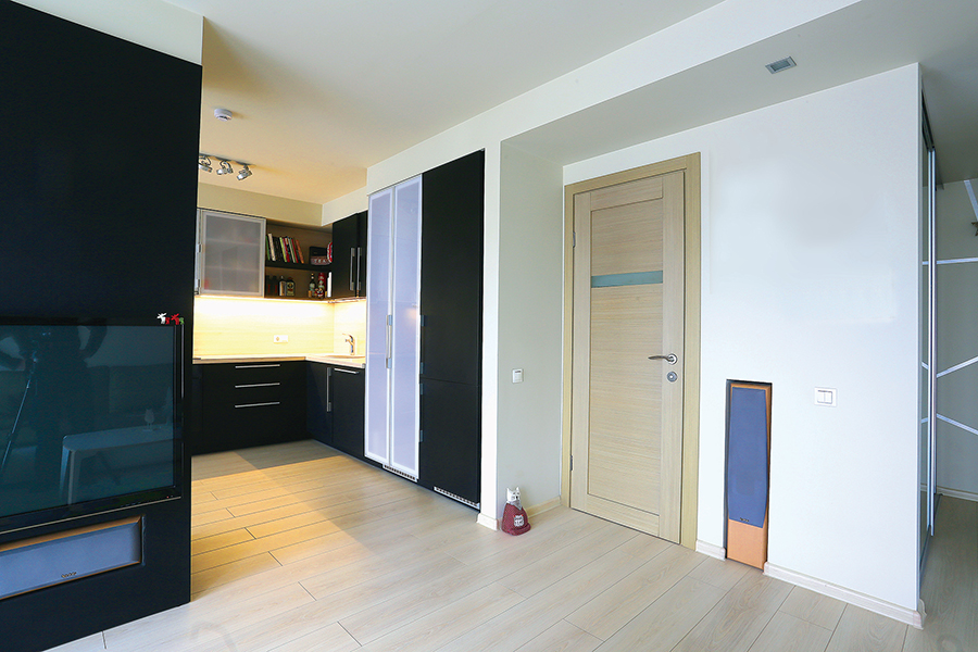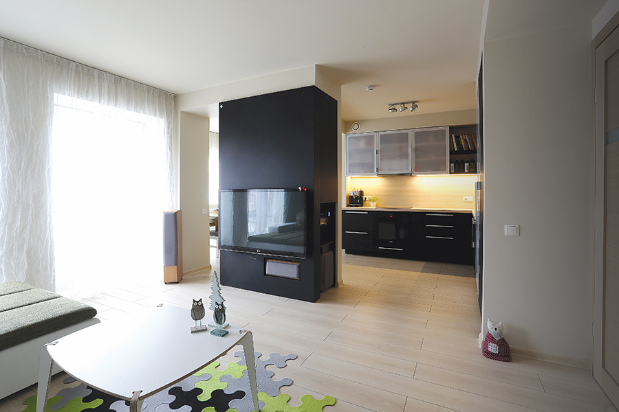 Beveik kambario viduryje įsisprendusi kolona dar padidėjo, mat ją architektai praplėtė ir pavertė ne tik kontrastingu akcentu – svetainės ašimi, čia sau buveinę įgijo garso ir vaizdo aparatūra. Televizorius, garso kolonėlės ir kita technika „sutūpė“ į jiems specialiai suformuotas nišas bei lentynas (7). Beje, vienai garso kolonėlei teko suformuoti nišą prieškambario spintoje. O visi elektros laidai buvo išvedžioti po grindimis, tad bendro vaizdo negadina.