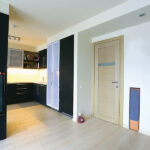 Pirmiausia Gitanos ir Audriaus komandai teko perplanuoti bendrąją gyvenamąją erdvę (1) , kad ji taptų funkcionalesnė. Tam holo zonoje buvo suprojektuota pertvara, kuri padėjo suformuoti nedidelį, tačiau šviesų ir pakankamai erdvų prieškambarį. Iš vienos pusės ji tapo sienine spinta, iš kitos – niša skalbyklei (2).