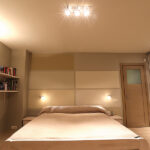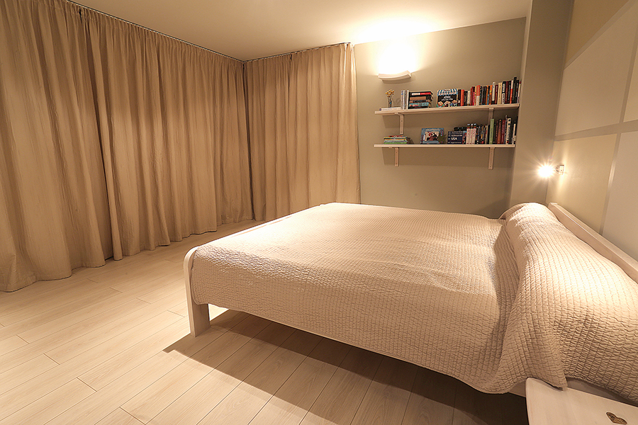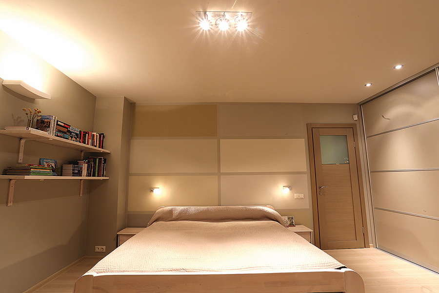 Originalus spalvinis sienos sudalijimas atkartoja sieninės spintos durų estetinį sprendimą. Į lubas virš spintos integruoti šviestuvai apšviečia drabužinės vidų, o maži sieniniai bra prie lovos puikiai tinka knygų skaitymui – tai bendras poros pomėgis.