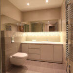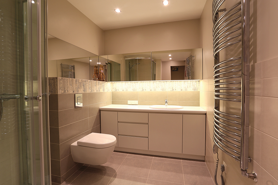 Vonioje visuomet prisikaupia įvairiausių daiktų: kosmetikos, higienos priemonių, rankšluosčių, tad jiems visiems sutalpinti reikia patogaus ir didelio baldo. Šeimininkai norėjo didelio stalviršio ir talpių spintelių. Po ilgų ieškojimų buvo įgyvendintas toks sprendimas: prie galinės sienos sumontuotas baldas su praustuve, o virš jo pakabintos spintelės. Taip patalpa neatrodo ištęsta, ji „kvadratiškesnė“. Prie šio efekto prisideda ir veidrodinės kabamųjų spintelių durelės (beje, jos atidaromos keliant į viršų – tai sumažina traumų tikimybę), kurios sklandžiai pereina į veidrodį ant gretimos sienos. Viskas kartu – tai tikras vonios kambarys, o ne vien higienos reikalams skirta patalpėlė.