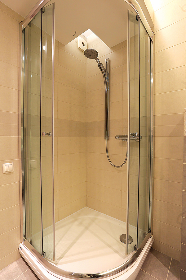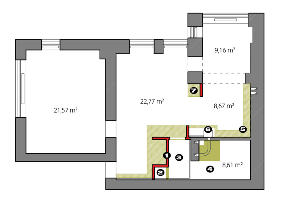 Antras dalykas, kurį architektai išsprendė vienu mostu, tai „nefotogeniškosios“ inžinerinės dalies užmaskavimas. Ką jie padarė? Ogi nuleido lubas (5) ir suformuotame laipte paslėpė viską, ką tik reikėjo. Čia tilpo ir dujų vamzdžiai, virtuvės zonoje – dar ir gartraukio. Nuleistos lubos taip pat priglaudė šviestuvus, o vonios kambaryje – dujų katilo dūmtraukį. Dėl pastarojo dušo zonoje lubas teko nuleisti labai žemai ir tai buvo dar vienas iššūkis: kad žemos lubos nekurtų slegiančio įspūdžio, architektai suformavo savotišką šulinį, iš kurio sklinda šviesa ir kuriame rado vietą ventiliacinės grotelės.