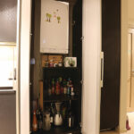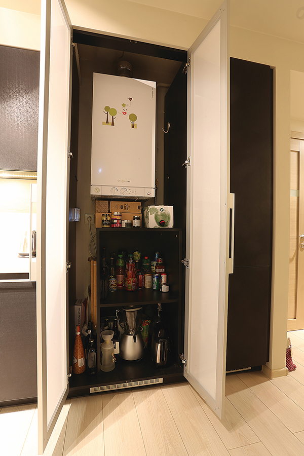 Virtuvės baldai paslėpė dujinį katilą (6). Nors jis, kaip ir daugybė kasdien reikalingų buities reikmenų, įkurdintas už matinio stiklo durų, vienintelis dalykas, išduodantis, kad tai nėra paprasta ūkinė spinta, – ventiliacinės grotelės baldo apačioje.