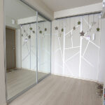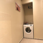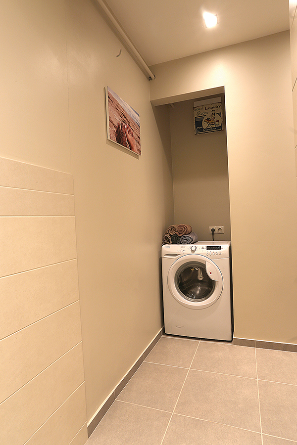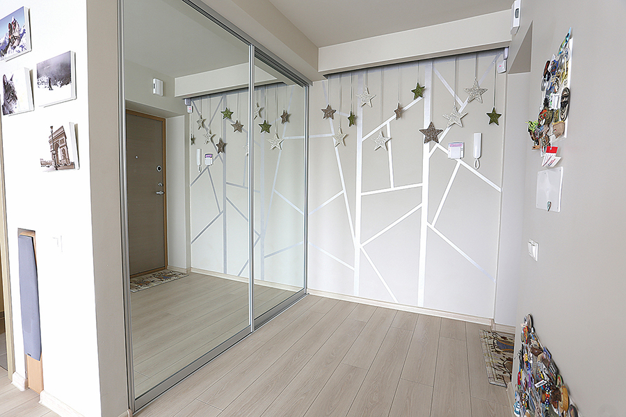 Stiklinės virtuvės spintos durys slepia dujų katilą. Prieškambario spinta taip pat turi savo nedidelę paslaptį: jos didelės veidrodinės durys, rodos, dengia itin erdvią drabužinę, tačiau iš tiesų spintos vidinis tūris kiek mažesnis, juk kitoje pusėje yra niša skalbyklei. Dėl šių veidrodinių slankiųjų durų ir lubose integruoto apšvietimo prieškambaris atrodo gerokai erdvesnis ir šviesesnis.