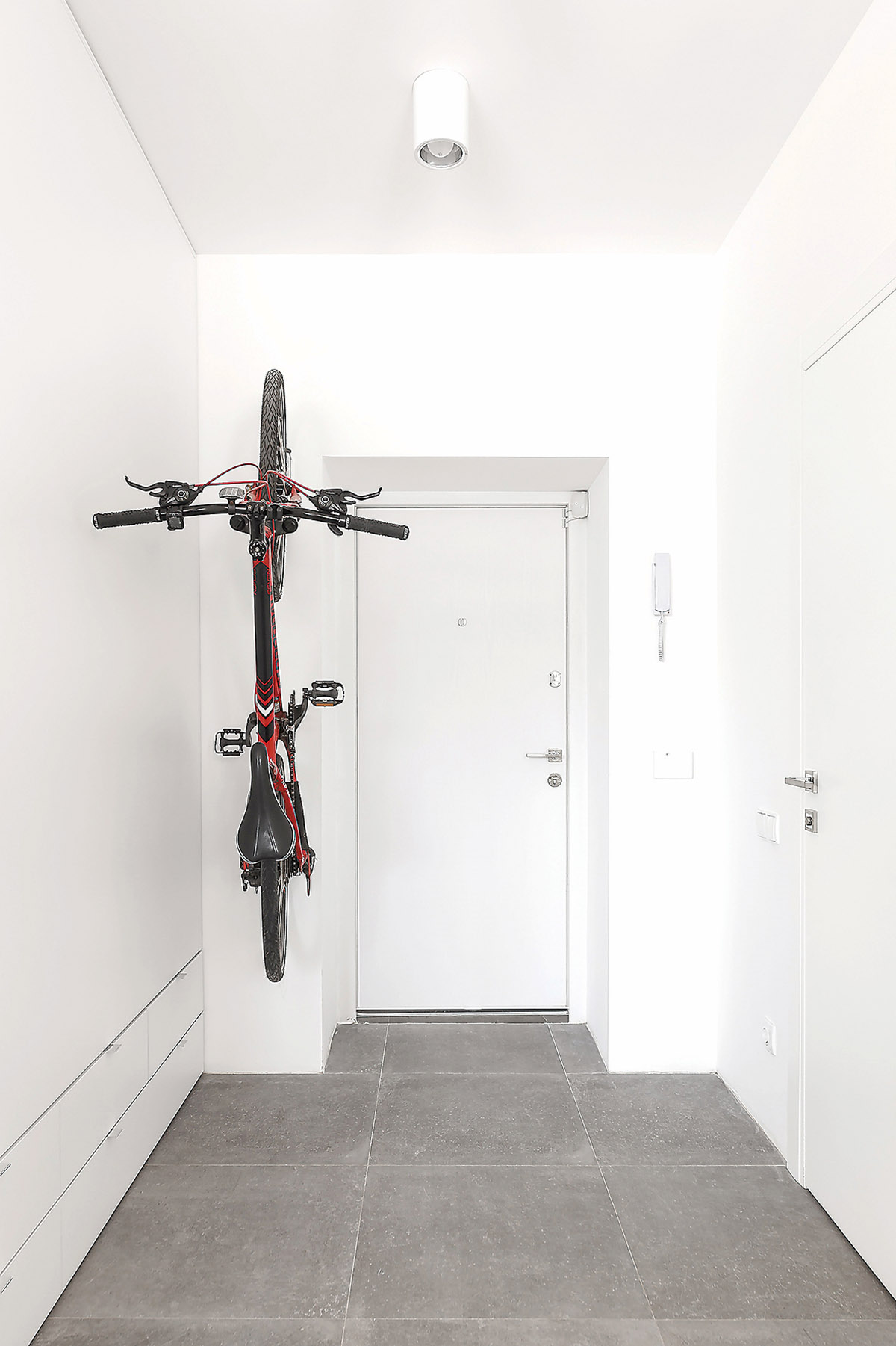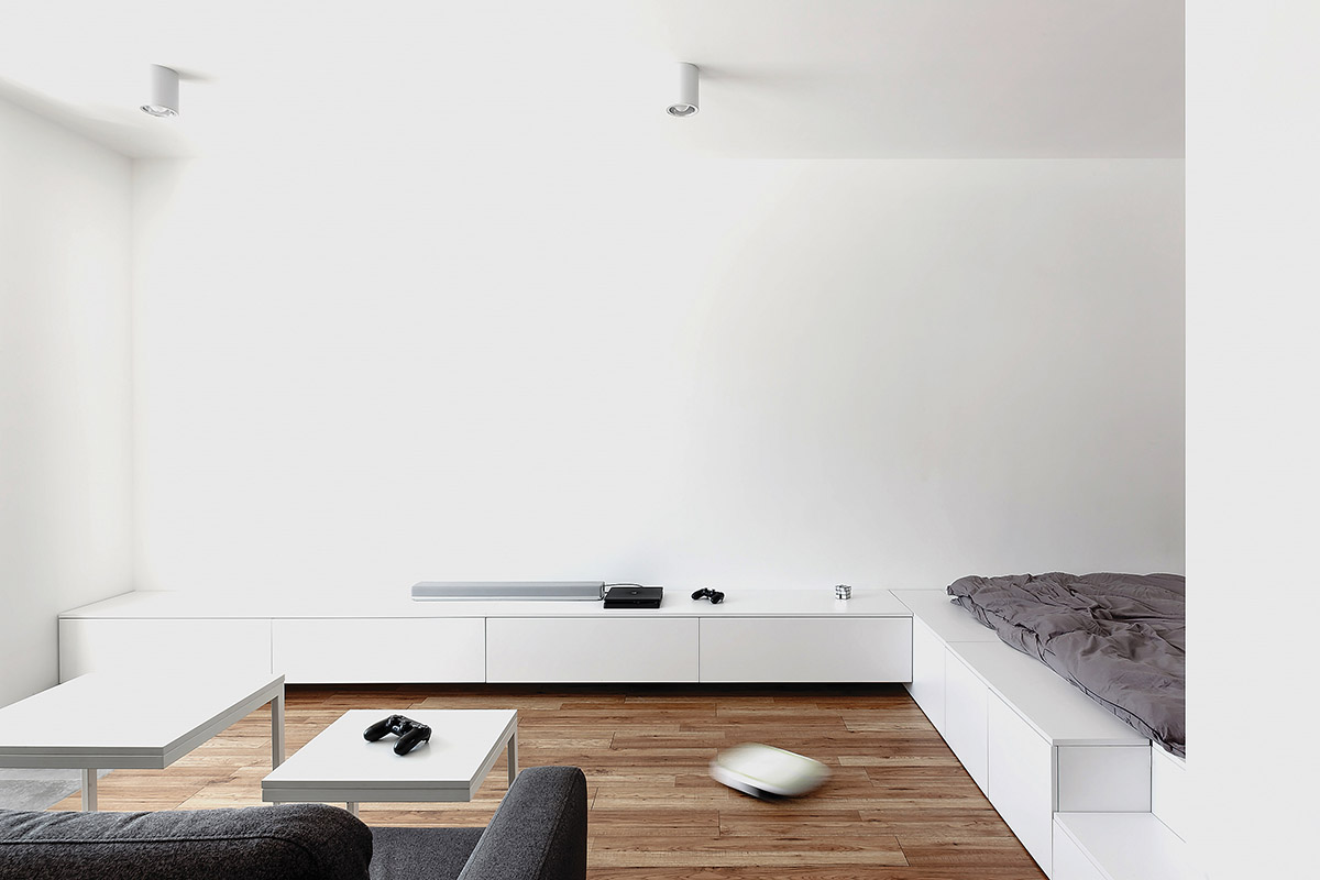 Virtuvės stalo salelėje padaryta niša, kurioje galima paslėpti dažnai naudojamus daiktus, kad jie visada būtų po ranka, tačiau nekristų pašaliniams į akis. Nišoje įrengtas miegamasis nuo prieškambario atskirtas iš abiejų pusių atsidarančia spinta.
