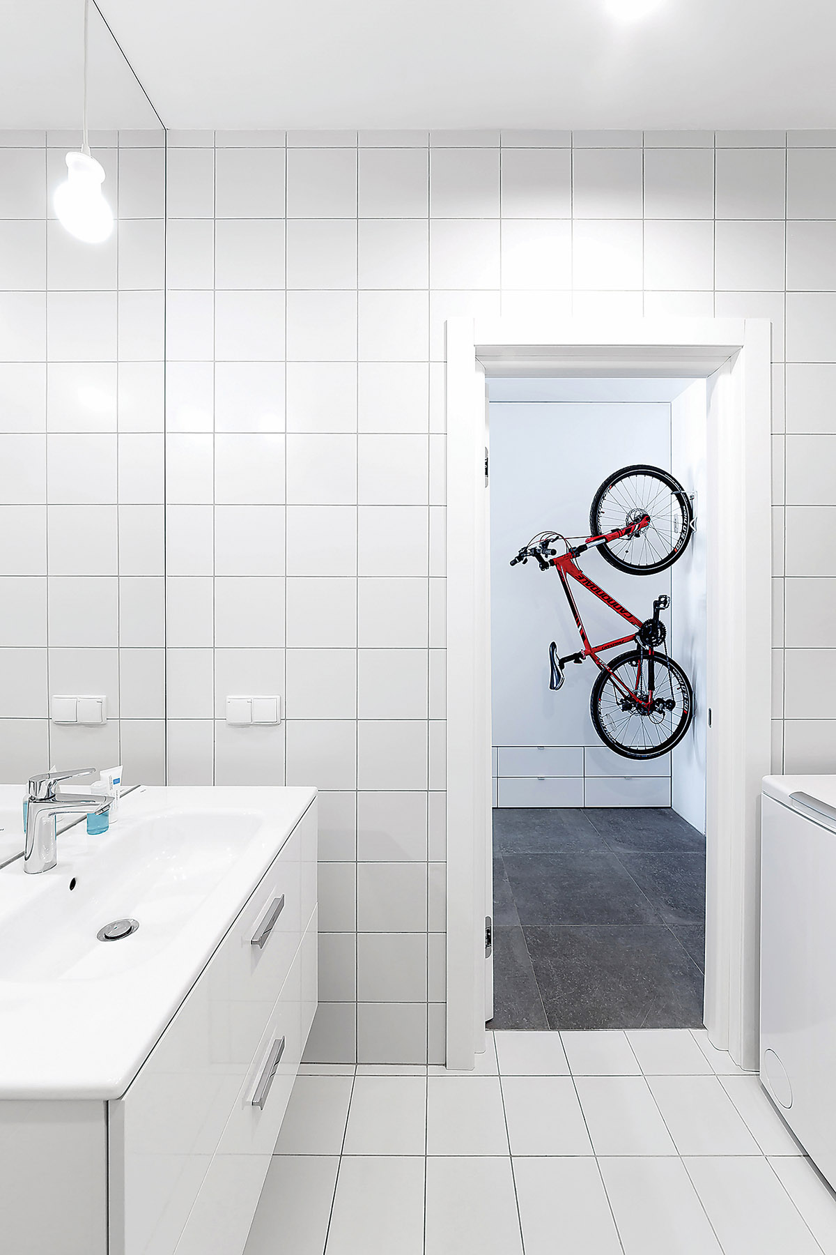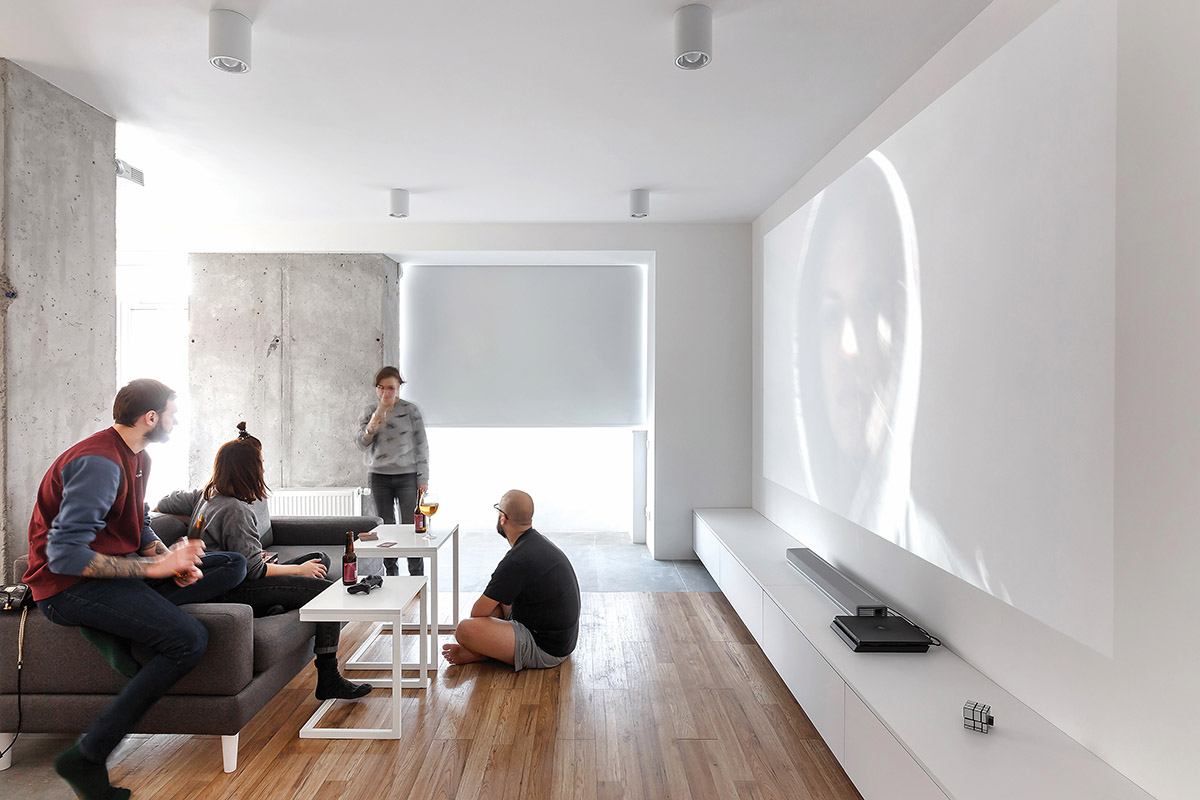 Kuriant interjerą svarbus kriterijus buvo aktyvus šeimininko gyvenimo būdas. Jis mėgsta keliauti, važinėtis dviračiais, bėgioti, žaisti kompiuterinius žaidimus, žiūrėti filmus, leisti laiką ne tik su keliais artimiausiais žmonėmis, bet ir su didesne kompanija. Kino teatro arba vakarėlio atmosferą sužadina bendroje zonoje, priešais sofą, kabantis projektorius – jis gerai matomas tiek iš bendro kambario, tiek iš virtuvės. Buto savininko hobius išduoda ant sienos kabantis dviratis.