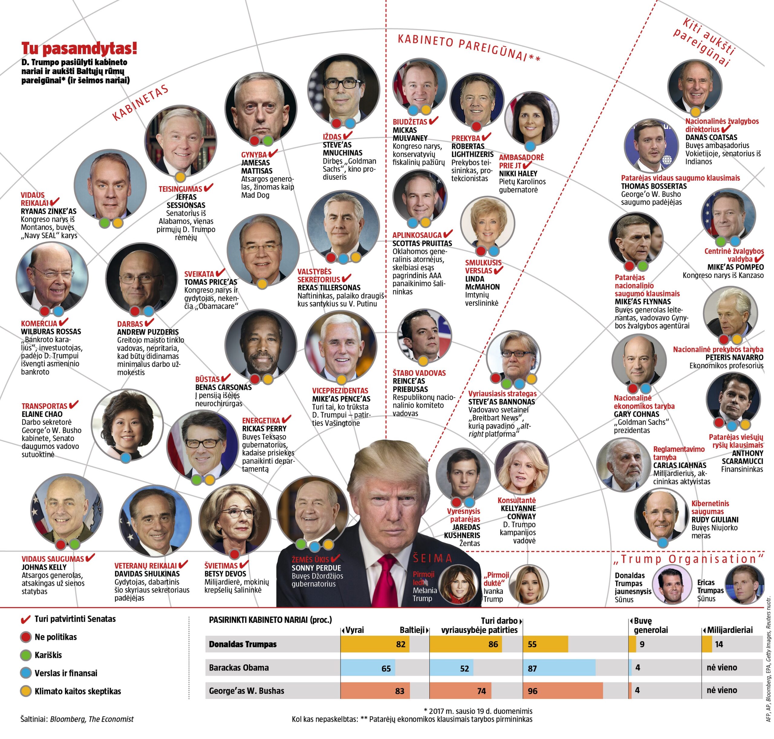 D. Trumpas jau paminėjo daugumą aukštų komandos narių, įskaitant kabineto sekretorius ir aukščiausius Baltųjų rūmų padėjėjus, o jų patvirtinimo procedūra Senate įsibėgėjo. Buvusio demokratų senatoriaus Harry Reido iniciatyva neseniai pakeitus Senato taisykles, kad paskirtus kabineto narius būtų galima patvirtinti paprastąja dauguma, tai tapo dar panašiau į formalumą. Kadangi abejus Kongreso rūmus kontroliuoja respublikonai, atrodo, lengvai einasi net prieštaringiausiai vertinamiems D. Trumpo numatytiems kandidatams, kaip antai į generalinio atornėjaus postą pasirinktas imigracijos priešas senatorius Jeffas Sessionsas iš Alabamos, kuris niekaip negali atsikratyti senų kaltinimų rasizmu.