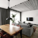 Naujos statybos name Ozo parke esančio būsto stilių griežtai apibrėžti būtų sudėtinga. Jame persipina modernios klasikos, rustikos ir industrinio stiliaus elementai. Pilka betono perdanga, lengvai apdoroto medžio stalai, seno autobuso sėdynes primenančios valgomojo kėdės, metaliniame narve uždaryta skalbyklė, moderni lova – visos priešybės susilieja į darnią visumą. Pati autorė savo darbo rezultatą įvardija kaip „moderną su subtilia ekletiška industrija“.