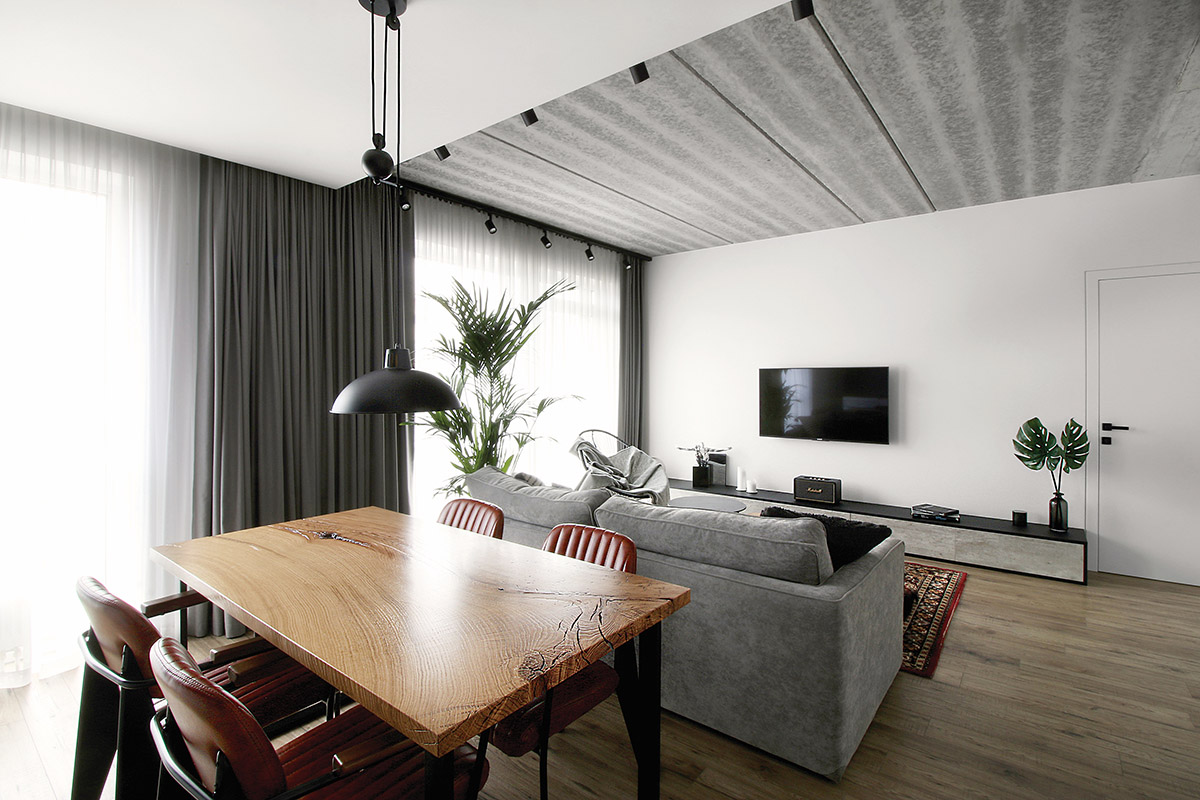 Interjero pagrindinėmis spalvomis dizainerė pasirinko pilką, juodą ir baltą. „Diskutuodami su užsakove, priėmėme sprendimą išlaikyti neutralią, neįkyrią spalvų gamą, kurioje tam tikros detalės „suskambėtų“ kaip meno kūriniai“, – teigia G. M. Pranckutė. Natūralios gamtos akcentai – lengvai apdoroto medžio staliukai, dizainerės teigimu, suteikia šilumos ir parodo, kaip neutrali erdvė natūraliai sustiprina išraiškingų daiktų „charizmą“.