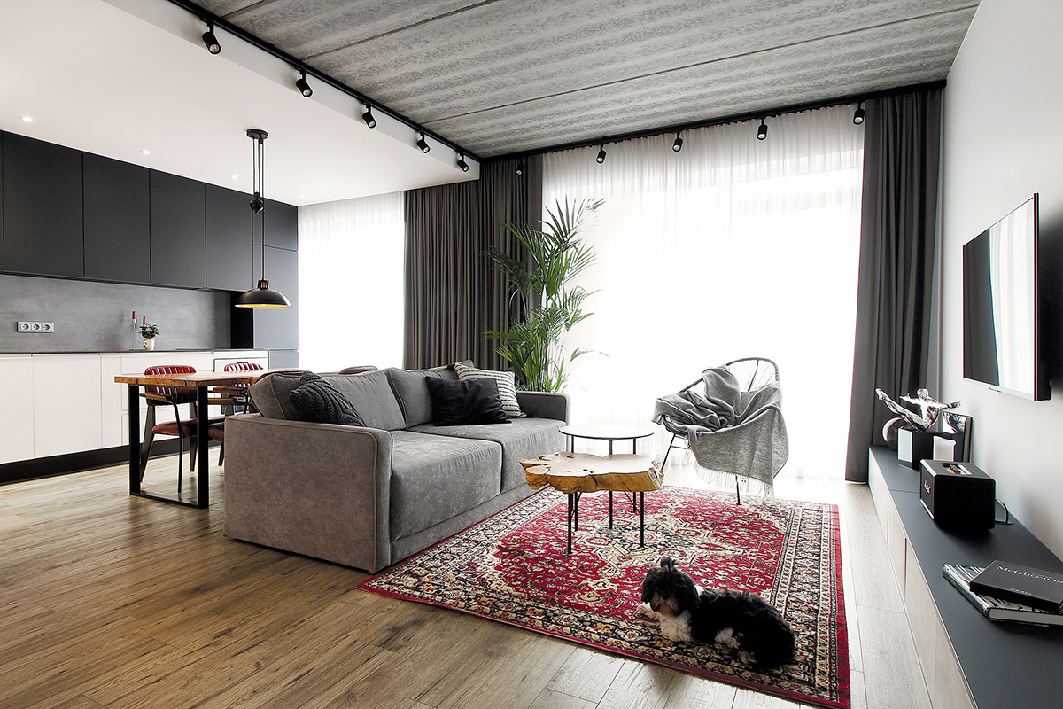 Baigiamuoju svetainės akcentu tapo margas ryškiaspalvis kilimas. Būtent jis sulaukė didžiausio dėmesio dizainerės feisbuko paskyroje. G. M. Pranckutė nustebo, kad būtent ši interjero detalė sukėlė tiek daug emocijų, bet džiaugiasi inicijavusi diskusiją. „Sutinku, kad kilimas nėra modernios išvaizdos, bet kiekviename kuriamame interjere man labai svarbu palaikyti dinamiką. Šis kilimas, mano manymu, yra tinkamas elementas, suteiksiantis judesio, kitokios emocijos ir kintančios energijos“, – savo sprendimą aiškina interjero dizainerė. Be to, anot jos, neutraliame interjere kilimas išlaiko spalvų pusiausvyrą.