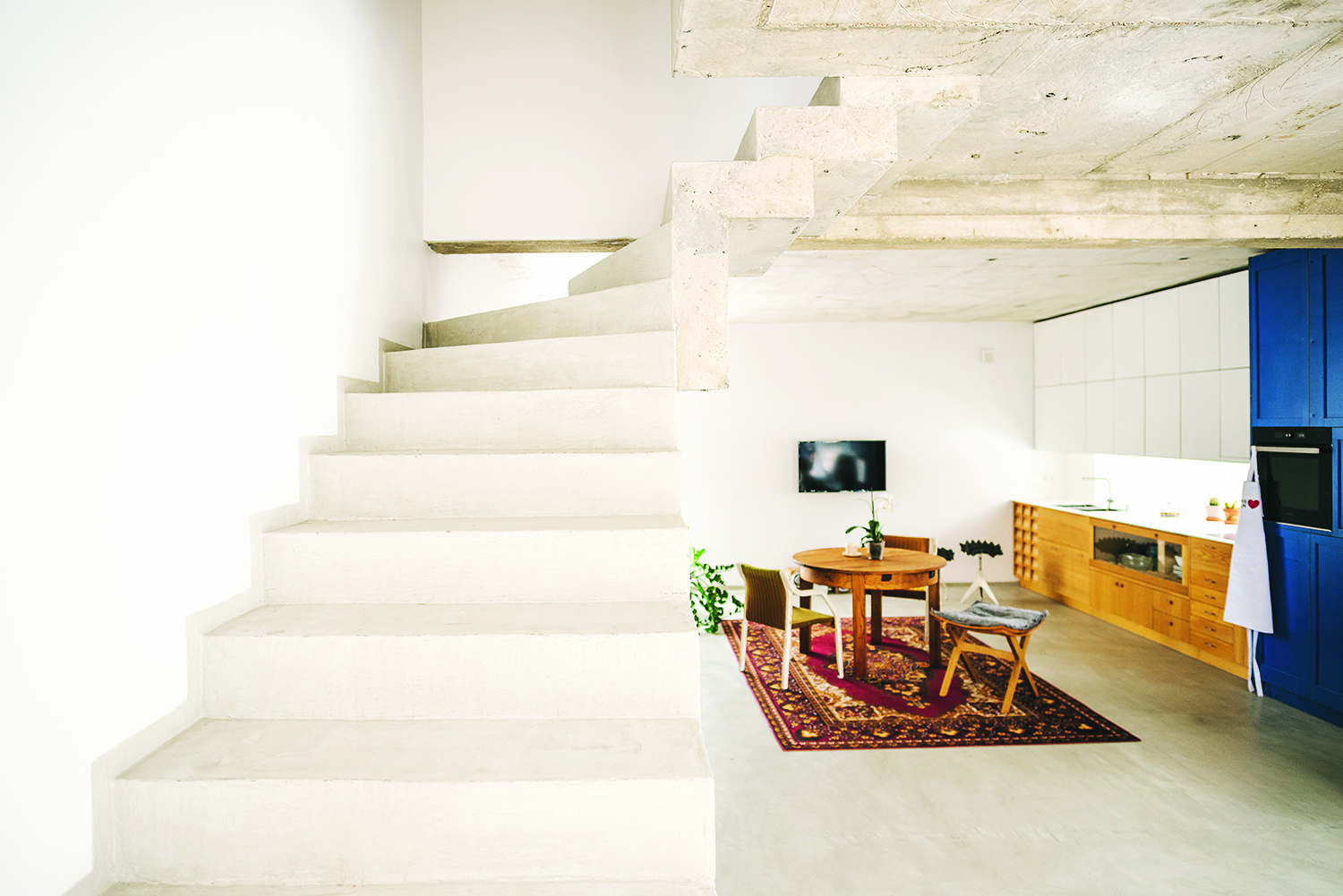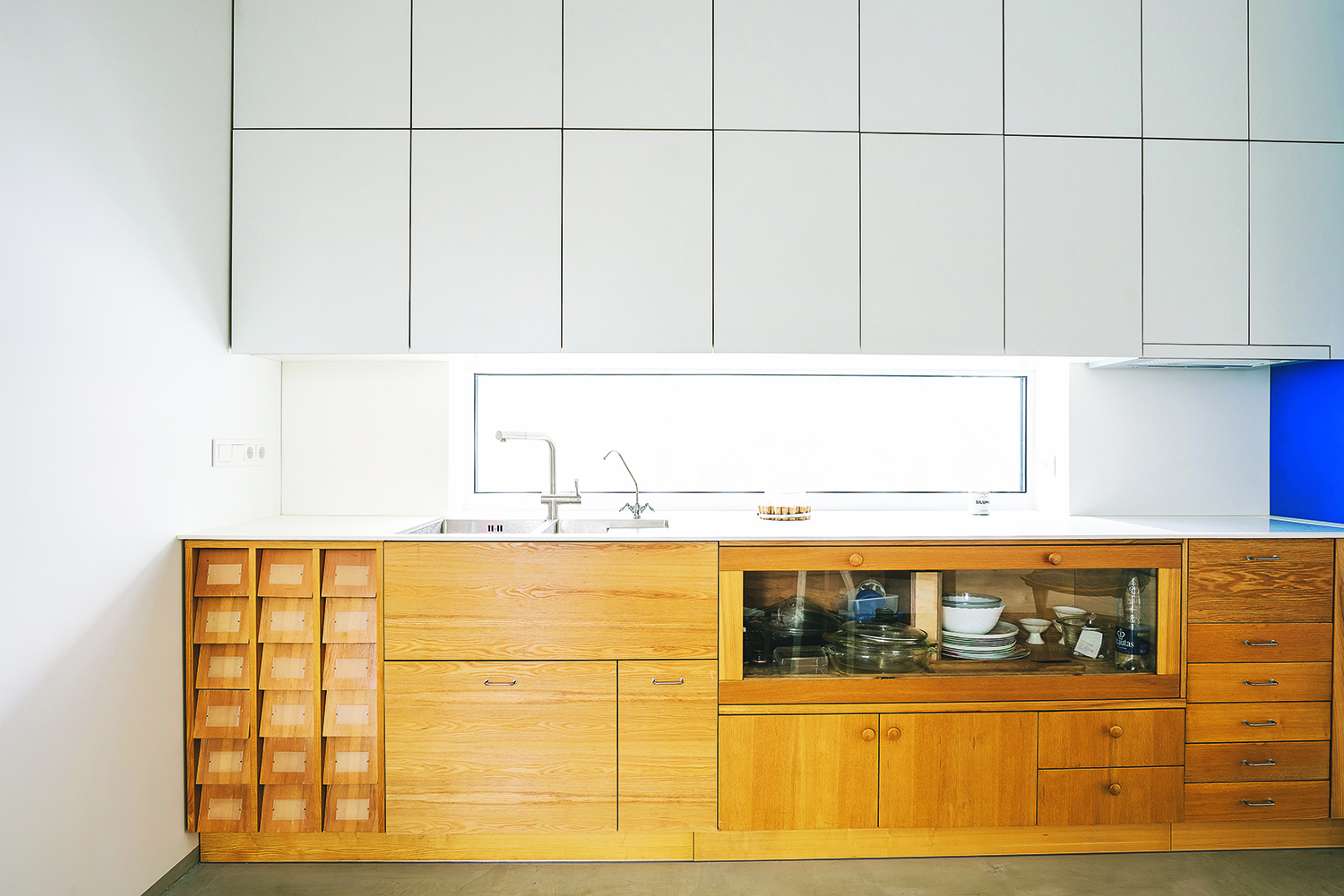 Įdomi mėlynų virtuvės ir kriauklės spintelių istorija. Šie baldai sukonstruoti iš 2015 metų Kauno bienalės informacinio stendo. Pernai festivalio organizatoriai jį atvežė į „Kūrybos kampą 360°“, prašydami perdaryti ir sukurti naujas instaliacijas. „Čia likučiai. Mėlyna spalva buvo iššūkis. Žmona iš pradžių nerimavo, kad ji netiks, bet sumontavome ir dabar džiaugiamės“, – pasakoja namo šeimininkas.