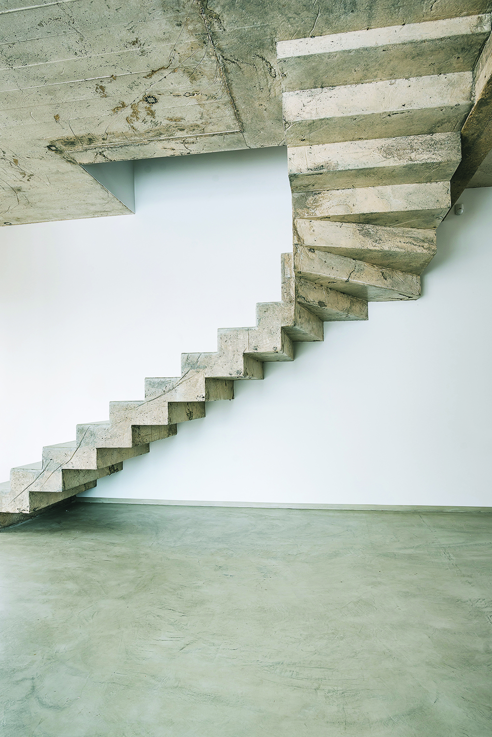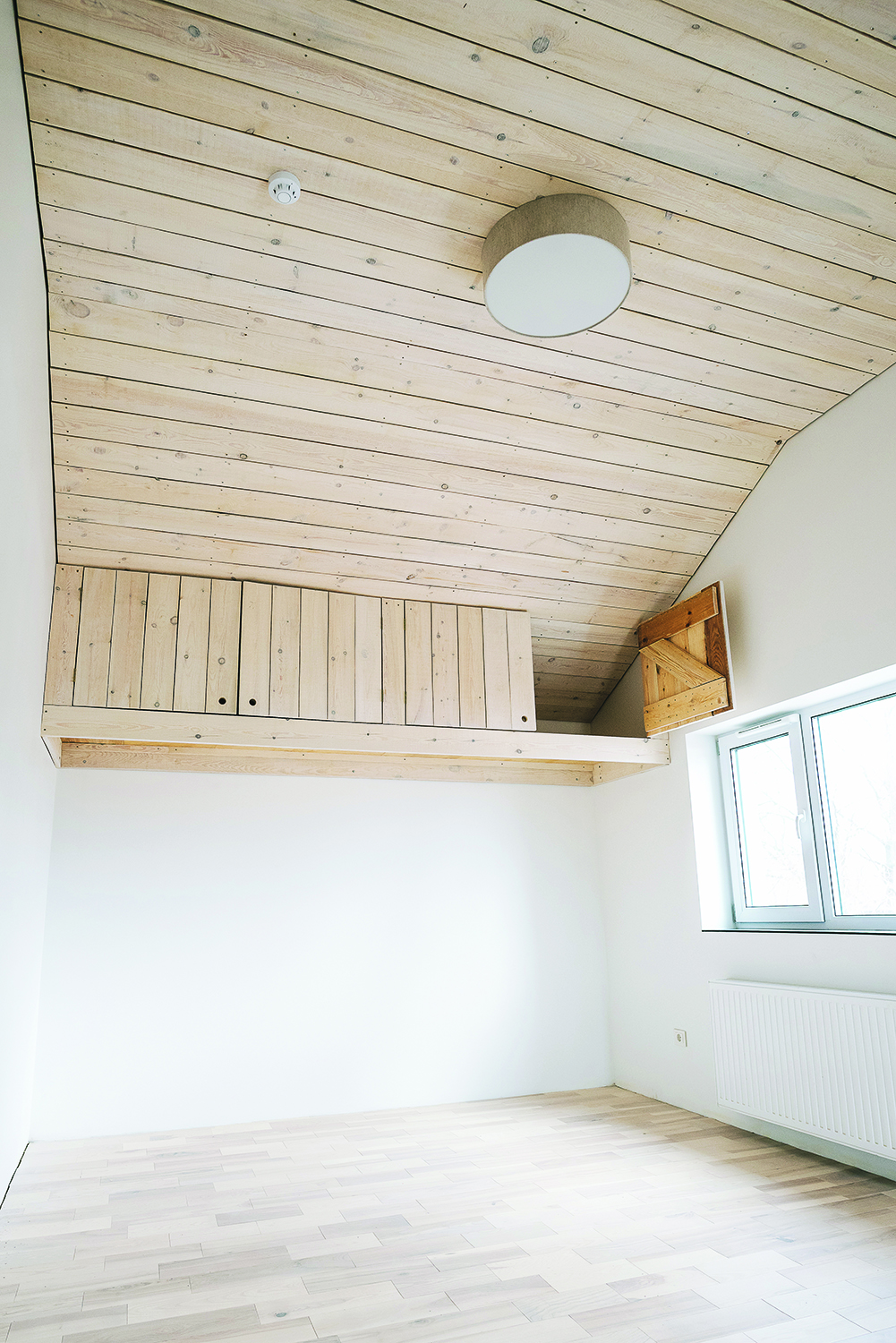 Betoniniais laiptais pakilus į viršų – trys kambariai. Lubas čia nuspręsta iškalti neobliuotomis, šiek tiek pašlifuotomis lentomis. Iš jų likučių šeimininkų miegamajame sukonstruota antresolė. Jos apačioje bus spinta su duris atstojančia užuolaida. G. Bučas paaiškina, kad minimaliai apdirbtos lentos atrodo natūraliai ir suteikia namams šilumos. Be to, atsisakius jų frezavimo, obliavimo ir įlaidų sutaupyta elektros ir brangios darbo jėgos.