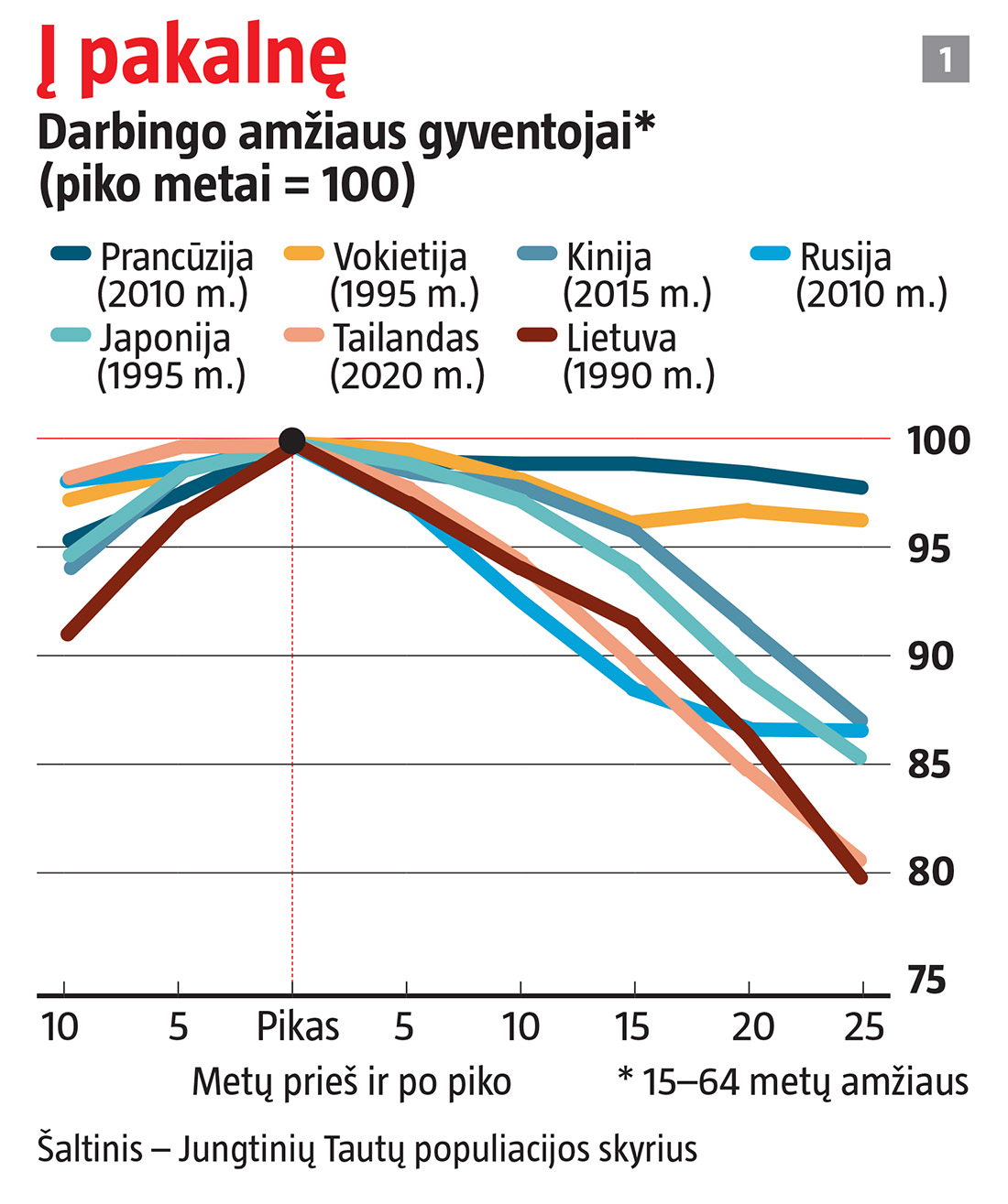 Lietuva viena pirmųjų įsiliejo į šią srovę. Šiandien darbingo (t. y. 15–64 metų) amžiaus žmonių skaičius mažėja 40-yje šalių, kai baigiantis XX a. 9-ajam dešimtmečiui tokių buvo tik devynios. Neseniai prie jų prisijungė Kinija, Rusija ir Ispanija, netrukus prisidės Tailandas ir Šri Lanka. Dabar gali nuvažiuoti nuo Vilniaus iki Lisabonos (arba, jei praleis pasieniečiai, į rytus iki Pekino) kirsdamas tik tas šalis, kuriose darbingo amžiaus žmonių skaičius mažėja.