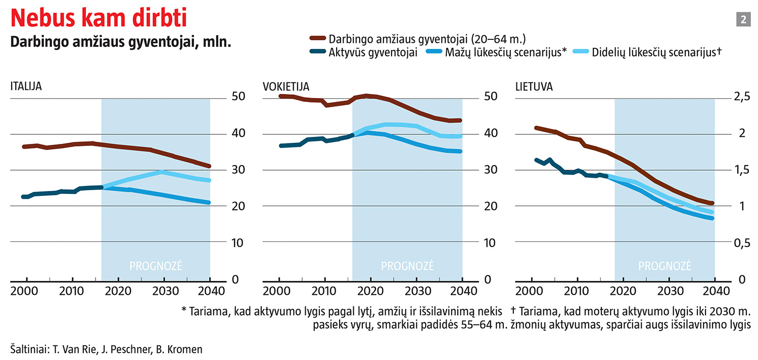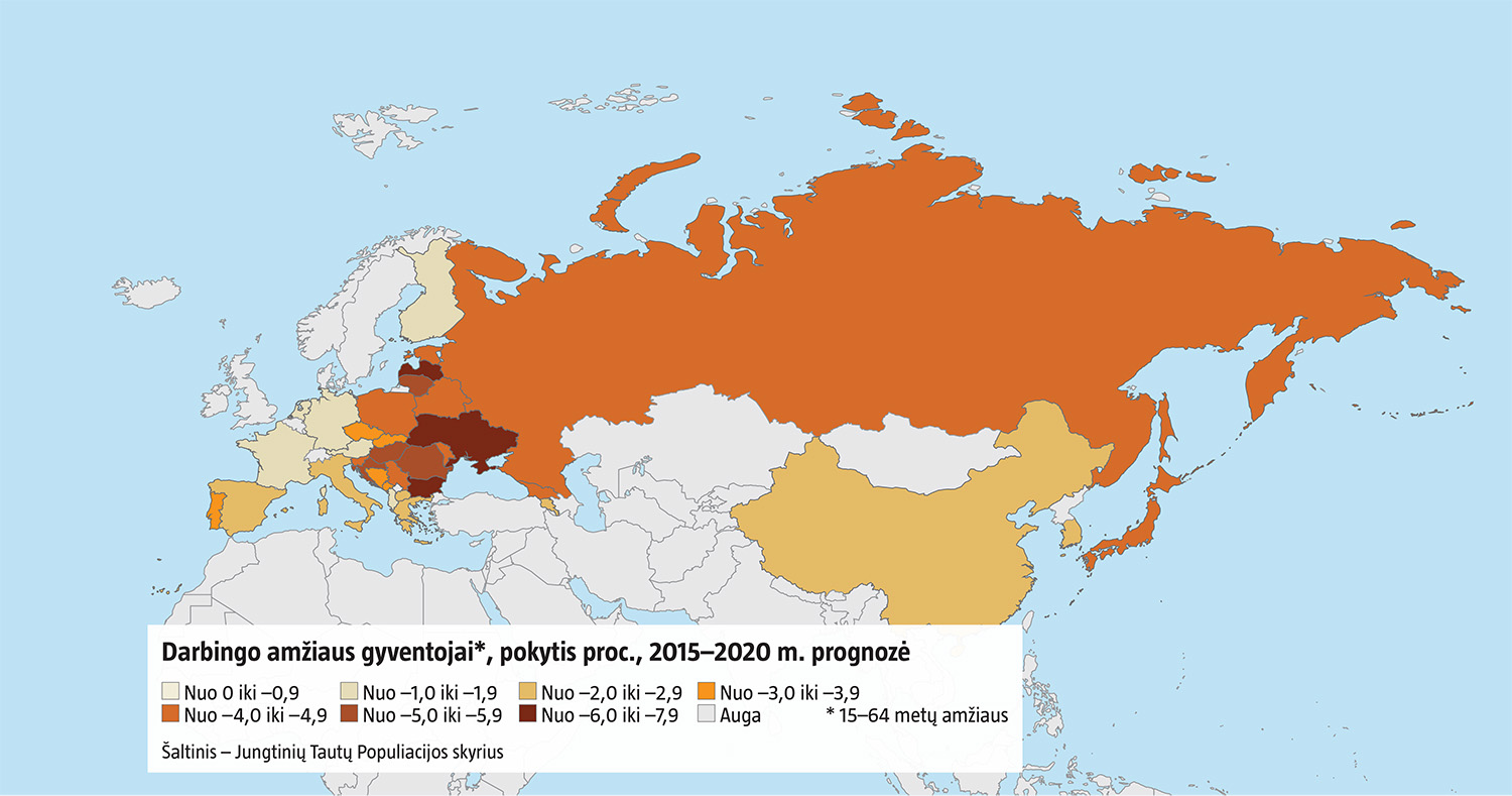 1990-aisiais 2,5 mln. siekęs 15–64 metų amžiaus lietuvių skaičius 2015 m. sumažėjo iki 2 mln. ‒ daugiausia dėl emigracijos. Šalį ištiko ir kita bėda. Kadangi XX a. paskutiniojo dešimtmečio pradžioje buvo staigiai smukęs gimstamumas, į darbo rinką įsilieja mažai naujokų. Nuo 2011 m. aštuoniolikmečių skaičius sumažėjo 33 proc. Jei Jungtinės Tautos neapsirinka, 2030 m. Lietuvoje liks tik 1,6 mln. darbingo amžiaus žmonių – kaip 1950-aisiais.