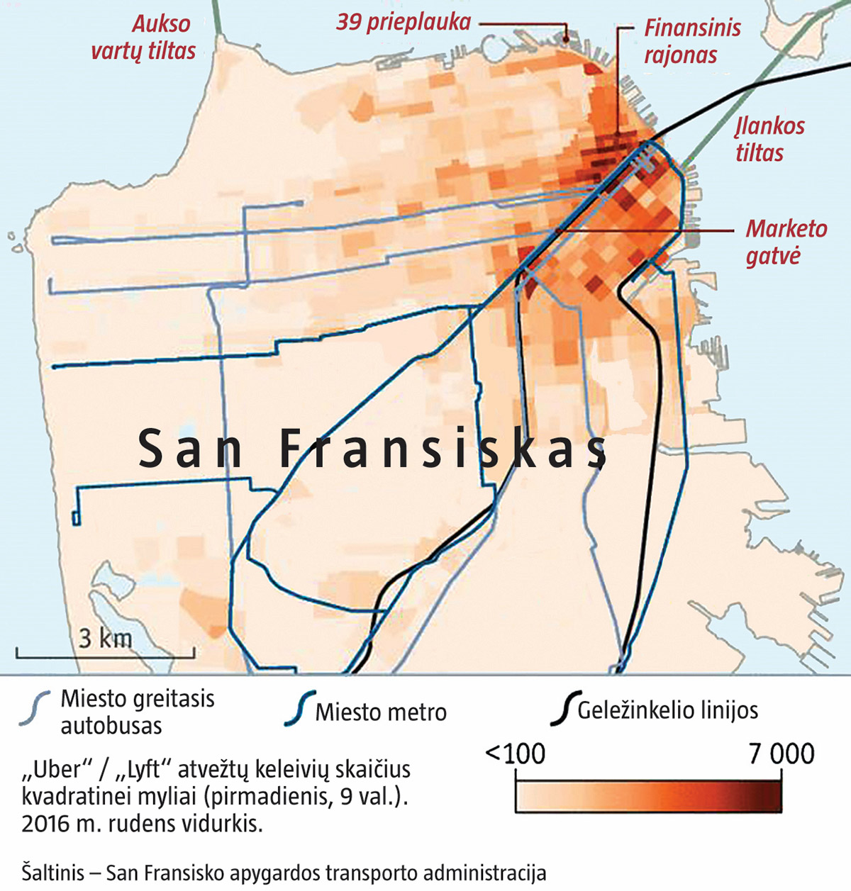 Kitur klientai dingsta nepaisant to, kad viešasis transportas išliko geras ar net pasitaisė. Gal jis pradeda atrodyti gana nykus atsiradus geresnėms alternatyvoms. Turbūt „Uber“, „Lyft“ ir kitos pavėžėjimo paslaugos ne tik griauna taksi verslą, bet ir traukia žmones iš traukinių ir autobusų. Darbo dienomis viešasis transportas San Fransiske susirenka 16 proc. visų srautų, o pavėžėjimo paslaugos – 9 proc. Panašu, kad žmonės į „Uber“ ir „Lyft“ daugiausia sėda važiuoti ten, kur ir masinis transportas puikiai išplėtotas (žr. žemėlapį). Penki Kalifornijos mokslininkai San Fransiske atliko tyrimą, per kurį klausė naudojusiųjų pavėžėjimo paslaugas, ką šie būtų rinkęsi pastarajai kelionei, jei tokia paslauga neegzistuotų. Trečdalis atsakė, kad būtų važiavę viešuoju transportu.