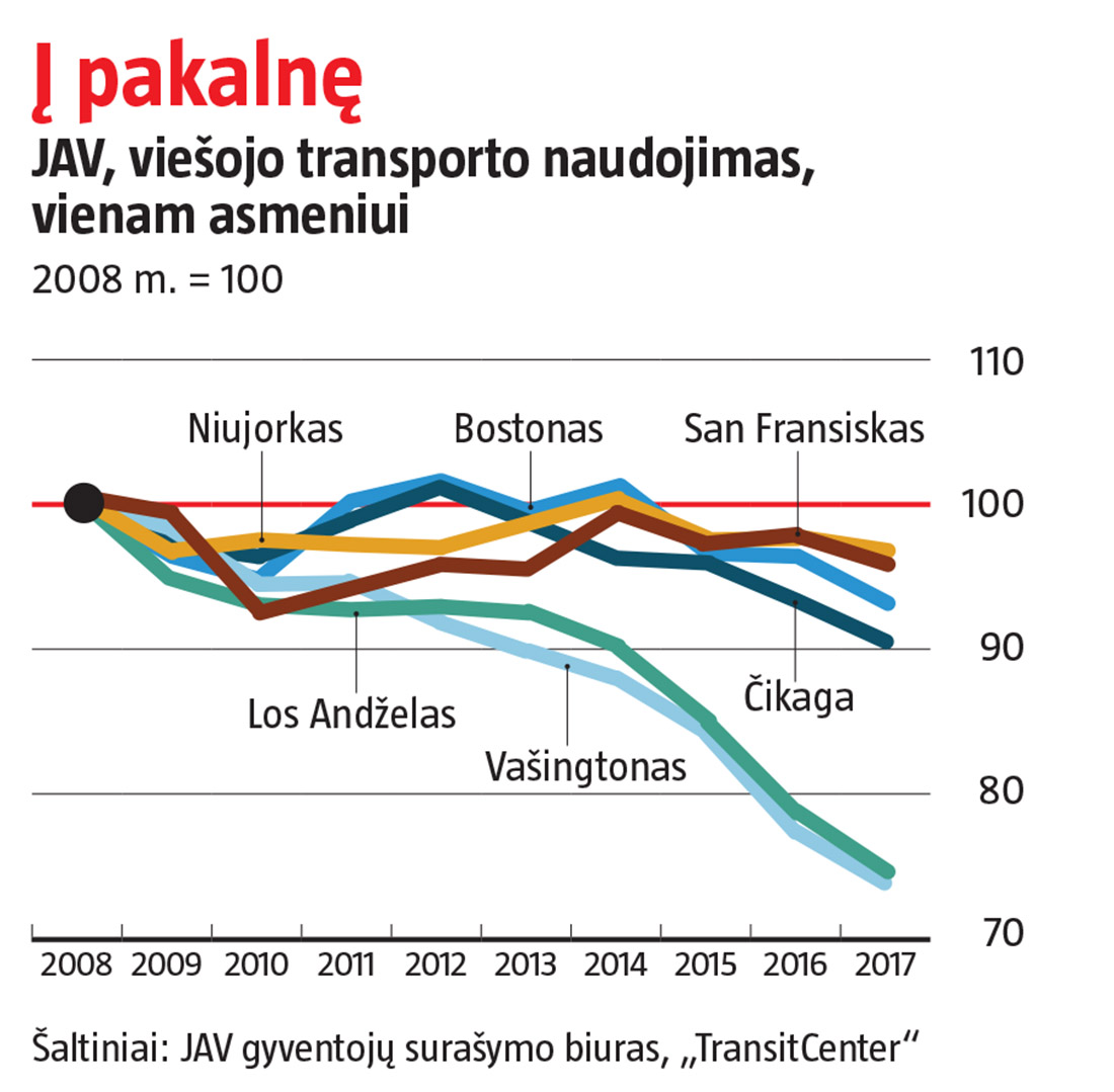 Angelų miestas – pirmose gretose, bet tendencija paplitusi plačiau. JAV viešojo transporto asociacijos duomenimis, keleivių skaičius šalies mastu pastaruosius trejetą metų smuko kasmet. 2016–2017 m. sumažėjo visų viešojo transporto rūšių (autobusų, metro, priemiestinių traukinių ir tramvajų) aptarnaujami žmonių srautai. Per dvylika mėnesių iki 2018 m. balandžio į viešąjį transportą darbo dienomis sėdančių niujorkiečių skaičius sumažėjo 2,8 proc., savaitgaliais – 4,2 proc., palyginti su ankstesniais metais. Čikagoje ir Vašingtone smuktelėjimas dar didesnis.