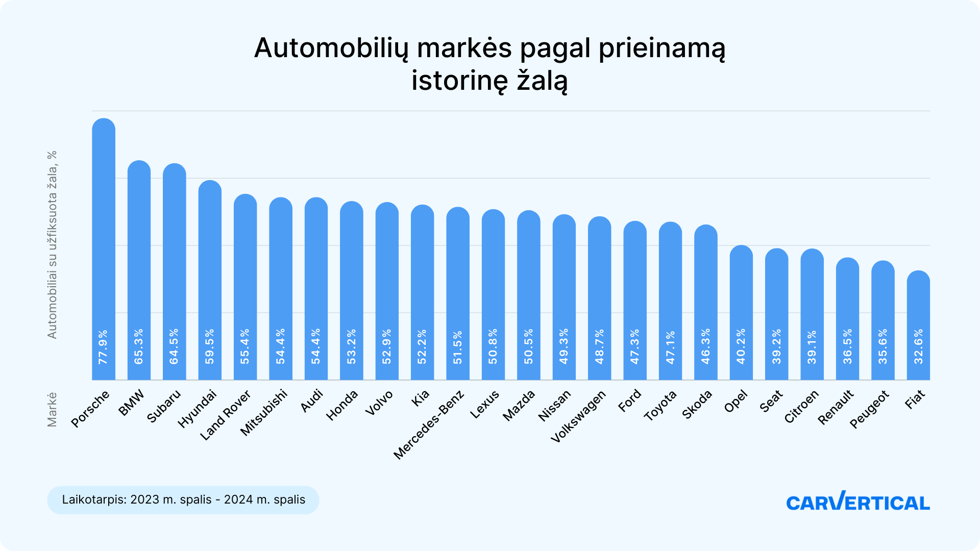 Iš visų 2024-aisiais tikrintų automobilių, daugiausia apgadinimų buvo patyrę „Porsche“ modeliai – net 77,9 proc. visų šios markės automobilių turėjo žalų įrašų.
