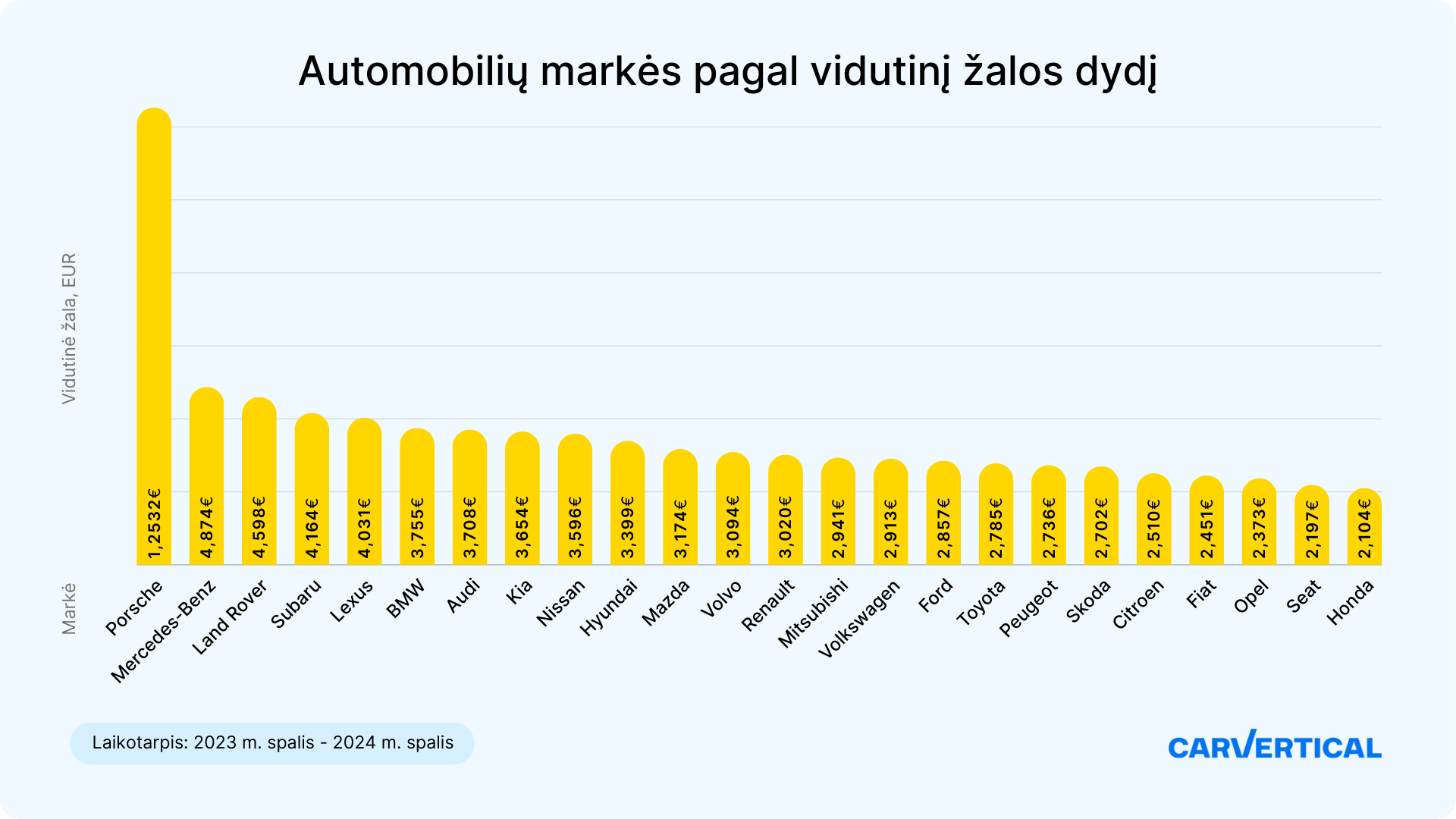 „Porsche“ automobilių Lietuvoje patirtą žalą draudimo bendrovės vidutiniškai įvertino 12 532 eurais – tai didžiausia apgadinimų vertė. Kitų prekių ženklų automobilių vidutinė žalos suma gerokai mažesnė: „Mercedes-Benz“ – 4 874 eurai, o „Land Rover“ – 4 598 eurai.