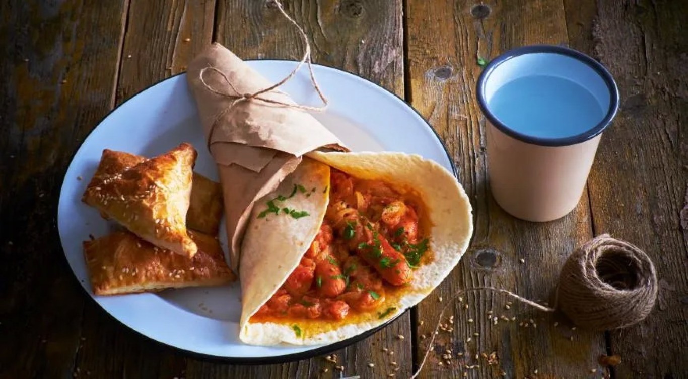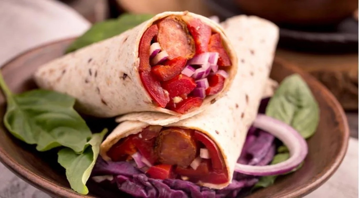 Reikės (6 porcijoms): 6 ilgų virtų dešrelių, 1 didelio svogūno, 3 šaukštų konservuotų pjaustytų pomidorų savose sultyse, 2 šaukštų saldžiarūgščių garstyčių, 6 tortilijų, 2 šaukštų alyvuogių aliejaus.
