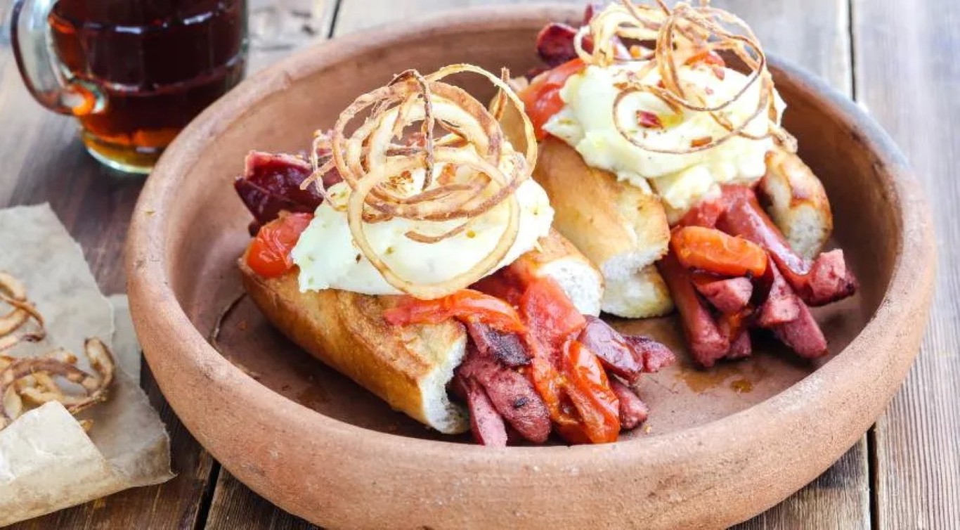 Dešrainiai su bulvių tyre, rūkytomis dešrelėmis ir gruzdintais svogūnais
