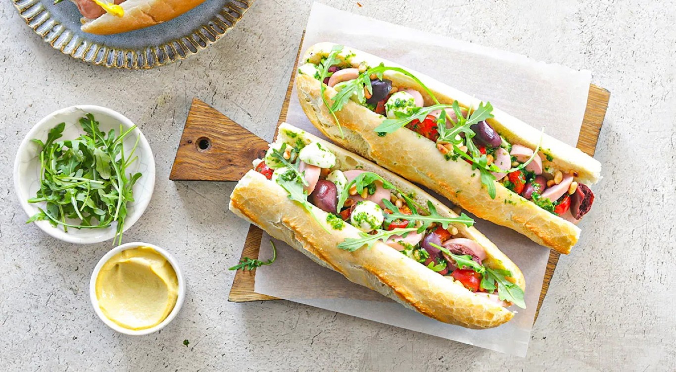 Reikės (2 porcijoms): 1 prancūziško batono, 4 virtų dešrelių, 125 g mocarelos (mažais rutuliukais), 125 g vyšninių pomidorų, 10 g juodųjų alyvuogių be kauliukų, 10 g kedrinių pinijų branduolių, 50 g gražgarsčių, 1 česnako skiltelės, 4 šaukštų alyvuogių aliejaus, 15 ml citrinų sulčių, druskos.