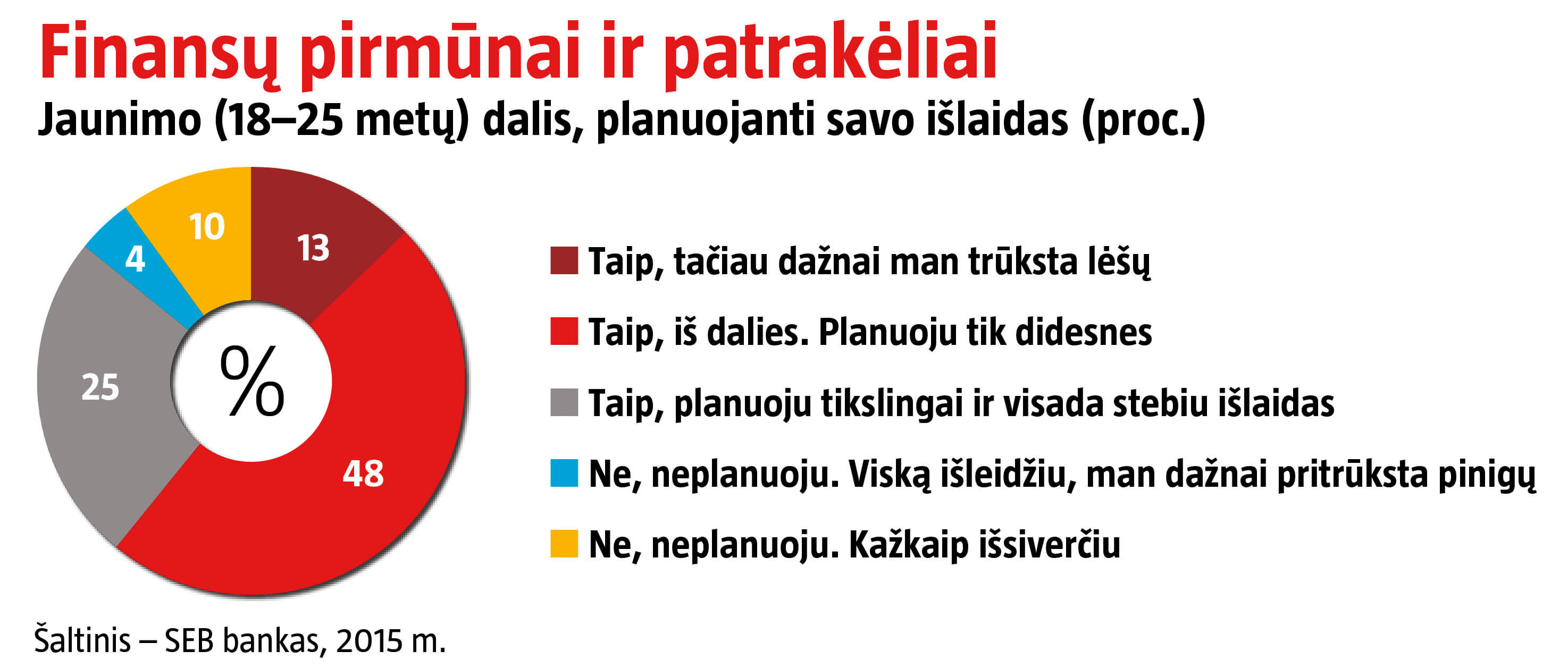 Finansinio raštingumo jaunimui galbūt ir trūksta, tačiau savo išlaidas planuoti ir nukreipti jie geba. SEB banko duomenimis, 71 proc. 18–25 metų Lietuvos jaunuolių gauna reguliarų atlyginimą ir savo lėšomis padengia kasdienes išlaidas. Jas planuoti ryžtasi net 86 proc. apklaustųjų, keturi iš penkių – konkrečiam tikslui, dažniausiai automobiliui, būstui ar kitiems didesnės vertės pirkiniams. Rečiausiai jaunuoliai taupo studijoms, kelionėms, vestuvėms ir juodai dienai.