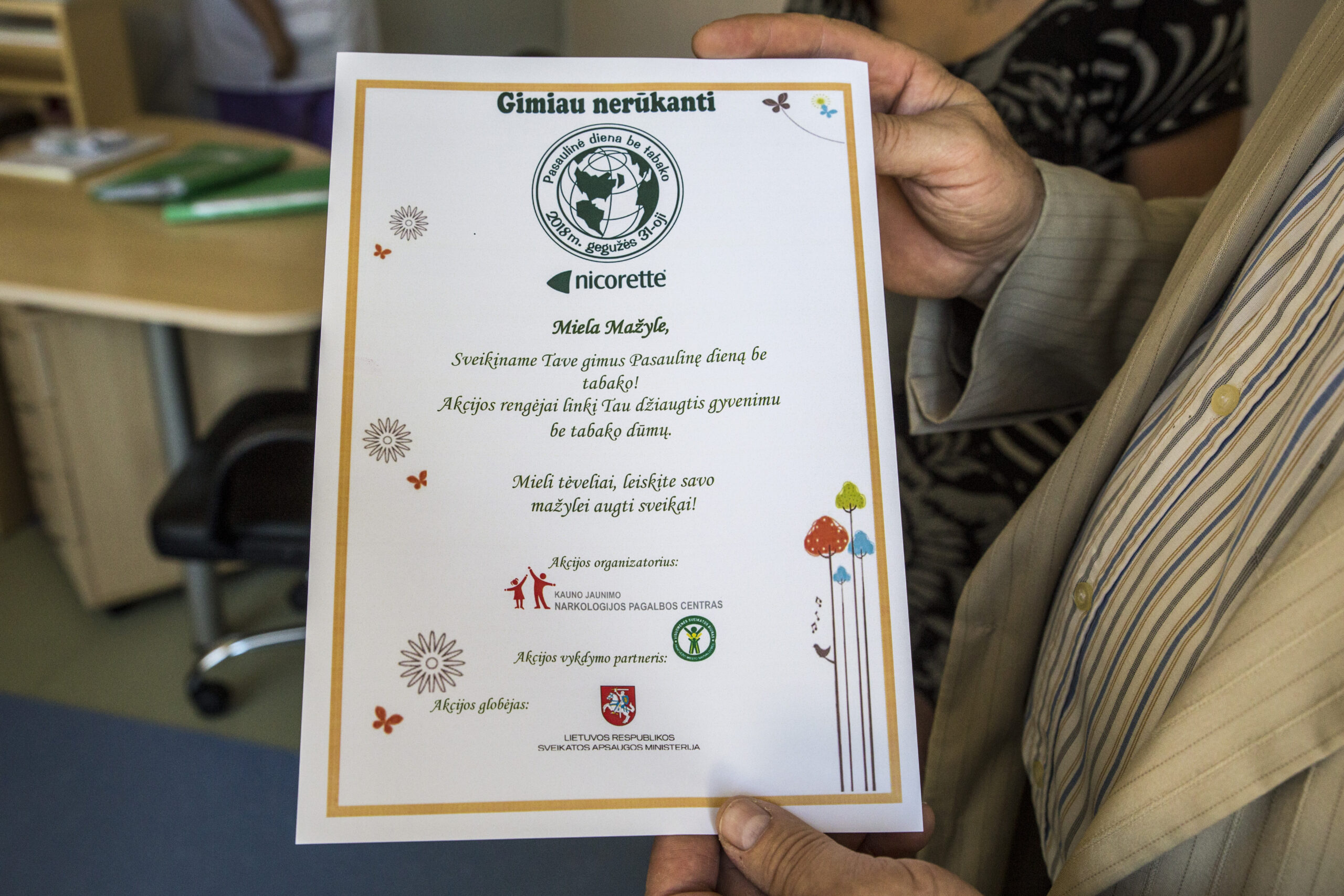 „Akcija „Gimiau nerūkanti (-is)“ birželio 1-ąją jau 17-ąjį kartą vyksta visoje Lietuvoje. Dieną be tabako gimę naujagimiai apdovanojami specialiais marškinėliais. Šitaip organizatoriai tėvams tarsi perduoda prašymą leisti gimti ir augti vaikams sveikiems. Pagrindinis akcijos tikslas – apsaugoti dabartinę ir būsimas kartas nuo tabako vartojimo sukeliamų sveikatos, socialinių, aplinkos ir ekonominių problemų bei priverstinio kvėpavimo tabako dūmais užterštu oru“, – kalbėjo naujagimius lankiusi Panevėžio miesto savivaldybės visuomenės sveikatos biuro vaikų ir jaunimo sveikatos priežiūros specialistė Giedrė Kundrotienė.