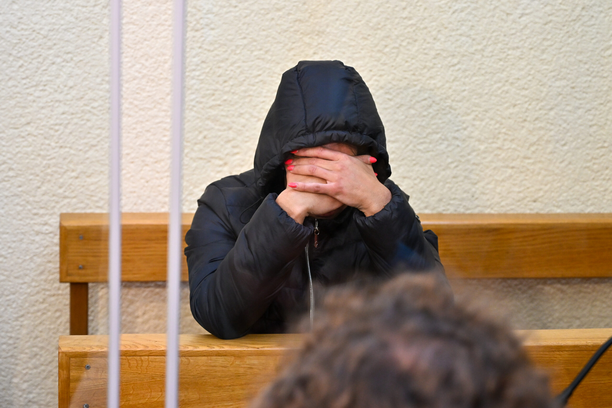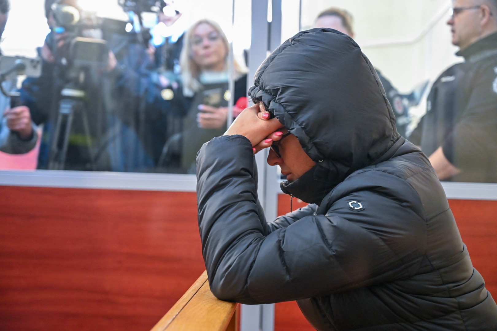 Baisių įtarimų dėl buvusio sutuoktinio, savo vaikų tėvo, nužudymo prislėgta moteris, iš konvojaus pareigūnų atvesta į teismo salę, vos nuėmus antrankius puolė rankomis dangstytis veidą.