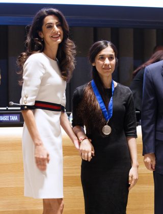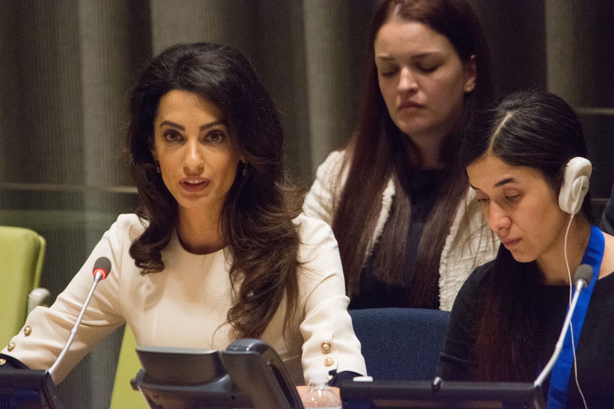 A. Clooney pati rašo savo kalbas ir jas rėžia su didžiule energija bei aistra. Rugsėjį jos žodžiai Jungtinėse Tautose pribloškė klausytojus. Teisininkė kalbėjo po Nadios ir susirinkusiems aukštiems pareigūnams priminė, kad vergų turgus, kuriame buvo parduota jos draugė, tebeveikia, ir kad dar nė vienas „Islamo valstybės“ narys nėra patrauktas baudžiamojon atsakomybėn dėl nusikaltimų jazidams.