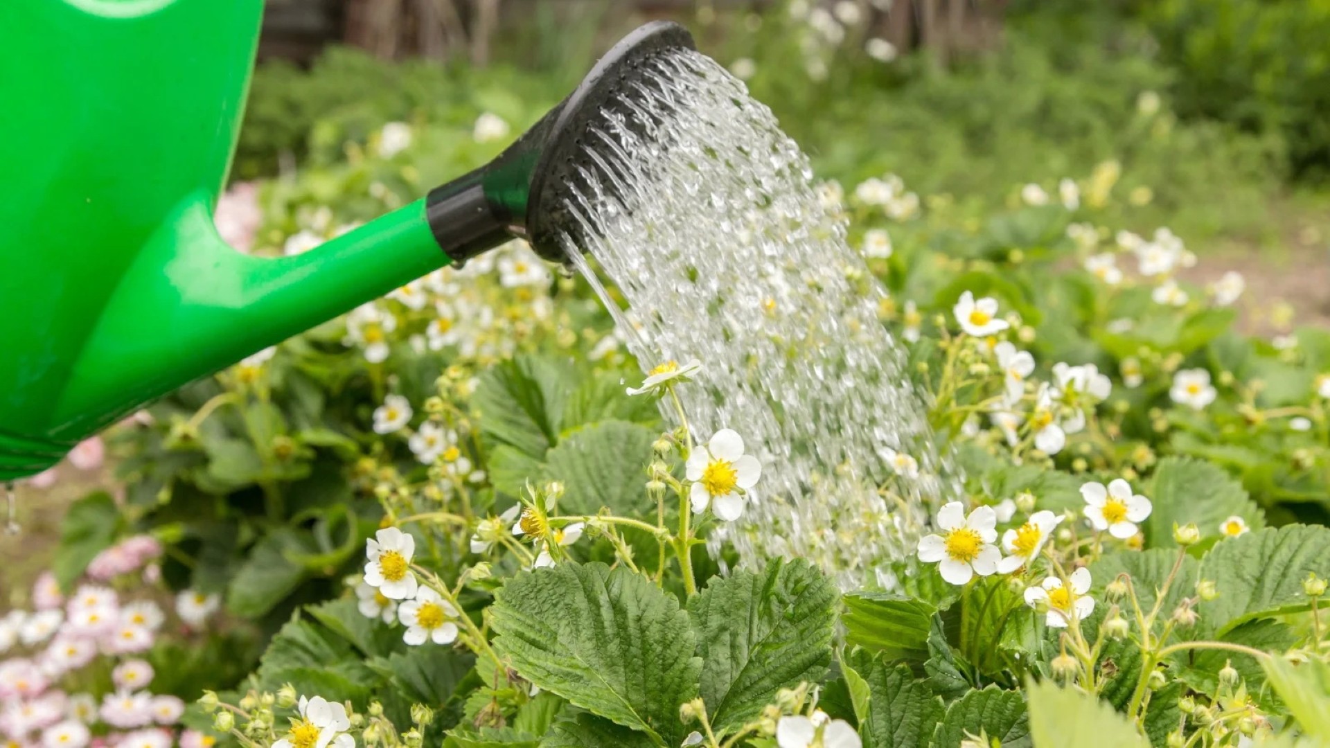 2. Žydėjimo laikotarpiu braškės laistomos mažiau ir tik greta krūmelių. Taip, kad vanduo nepaliestų žiedų ir nenuplautų žiedadulkių (iki pasirodant pirmiesiems žiedeliams ir nuskynus uogas laistyti galima ir ant lapų).