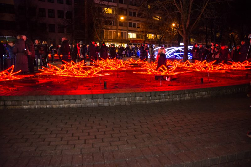 Nepabūgę pliaupiančio lietaus, penktadienio vakarą panevėžiečiai skubėjo pasigėrėti neįprastai pasidabinusiu miestu ir modernios eglutės įžiebimu. Ceremonija prasidėjo liūdnosios pasakos „Mergaitė su degtukais“ motyvais, tačiau niūrią nuotaiką greitai praskaidrino šokiai, sveikinimo žodžiai ir gerais darbais džiuginantys panevėžiečiai. Renginio atmosfera buvo tokia gera, kad prieš pat Kalėdų simbolio įžiebimą nustojo lyti lietus.