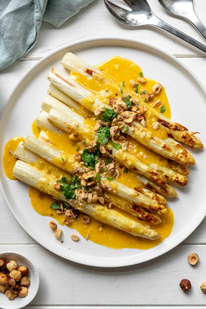 Šparagus nuvalykite, kietus galiukus nupjaukite. 12 minučių pavirkite pasūdytame vandenyje su žiupsneliu cukraus ir 1 šaukštu sviesto. Nusausinkite.