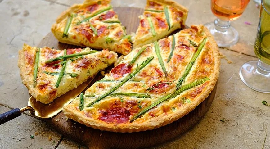 Reikės (6 porcijoms): 150 g šparagų, 1 svogūno, 150 g saliamio, 100 g šoninės, 100–120 g mocarelos, 330 ml grietinėlės (35 proc.), 3 didelių kiaušinių, 1 kiaušinio trynio, 1 šaukštelio kukurūzų krakmolo, žiupsnelio muskatų, druskos; tešlai: 240 g miltų, 180 g sviesto, 2 didelių kiaušinių, 1 kiaušinio baltymo, 40 ml grietinėlės (35 proc.), 1 šaukštelio druskos.
