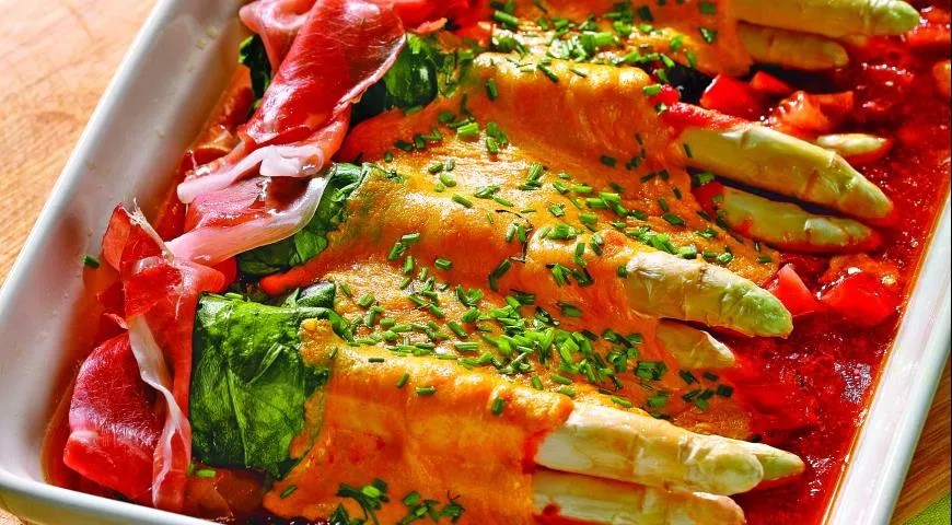 Reikės (4 porcijoms): 5 šaukštų smulkintų laiškinių česnakų, 2 kg baltųjų šparagų, druskos, 3 šaukštų grietinėlės, 1 vidutinio dydžio pomidoro, 1 šaukšto paprikų pastos, 8 gabalėlių Parmos kumpio, žiupsnelio druskos, 15 g šviežių špinatų lapų, nedidelio ryšelio bazilikų, 2 šaukštų sviesto, 80 g tarkuoto gaudos sūrio, 2 česnako skiltelių.