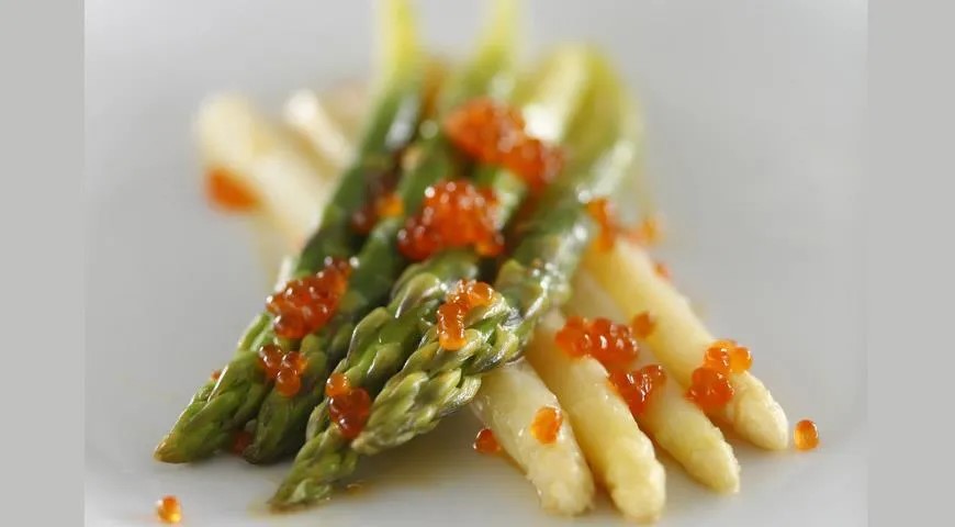 Reikės (4 porcijoms): 16 žaliųjų šparagų, 16 baltųjų šparagų, jūros druskos, 4 šaukštelių raudonųjų ikrų; padažui: 4 kiaušinių trynių, 2,5 šaukšto citrinų sulčių, 0,5 šaukšto Vorčesterio padažo, 2,5 šaukšto sviesto, druskos.