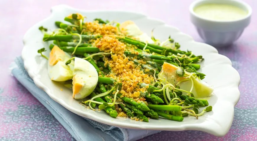 Reikės (4 porcijoms): 4 šoninės juostelių, 4 kietai virtų kiaušinių, 100 g šviežios baltos duonos trupinių, 400 g šparagų (kuo plonesnių), 2 virtų kiaušinių trynių (ir baltymų – patiekti), saujos rėžiukų, 200 g riebios grietinės, 2 šaukštų Dižono garstyčių, druskos.