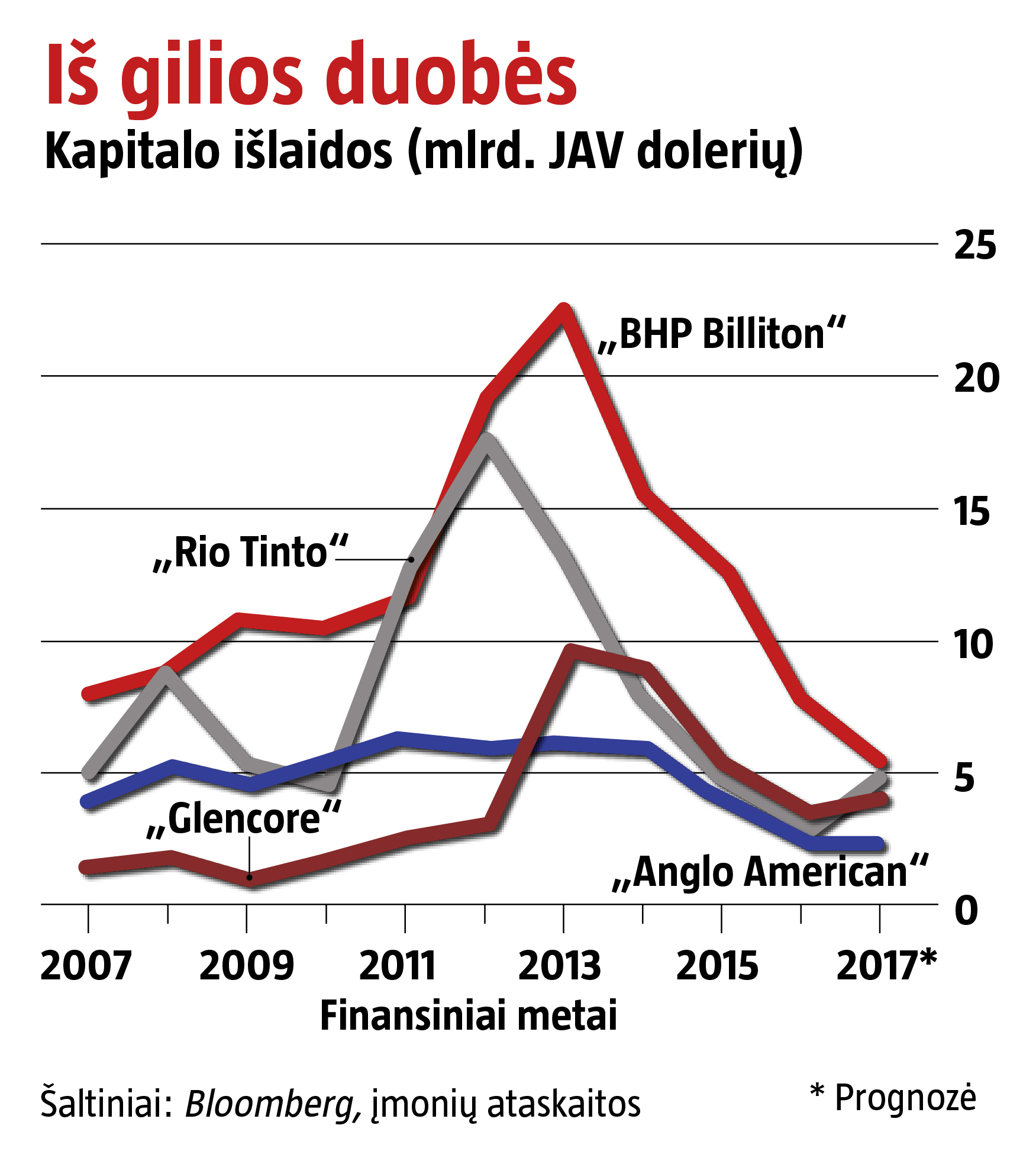 Posūkį lėmė kritusi pasiūla: ir valingai – siekiant padidinti žaliavų kainas, ir nevalingai – dėl streikų, atsisakymo dirbti. Kapitalo išlaidos nuo 2013 m. susitraukė daugiau kaip dviem trečdaliais (žr. grafiką). Imtis naujų rimtų kasybos projektų nelinkusi nė viena bendrovė. Antai, pasak I. Glasenbergo, naujų vario projektų sąrašas sektoriuje trumpesnis, nei buvo iki Kinijos bumo. Milžiniška „Rio“ valdoma Oju Tolgojaus kasykla Gobio dykumoje, Mongolijoje, – reta išimtis. Visoms kasybos bendrovėms svarbiausia yra sutvarkyti balansą ir atsilyginti lojaliems akcininkams.
