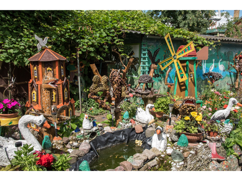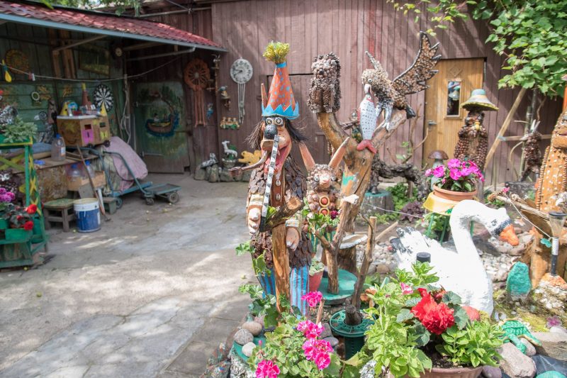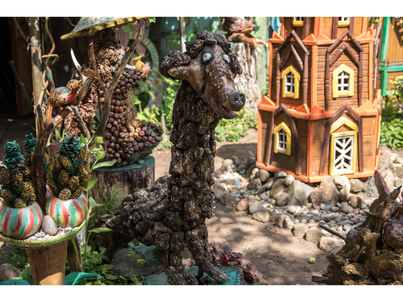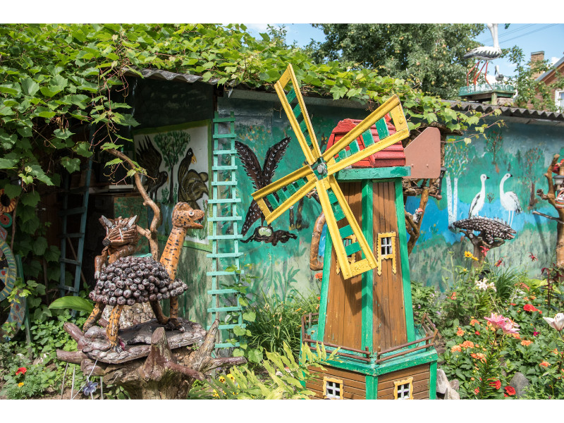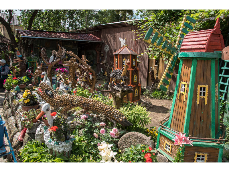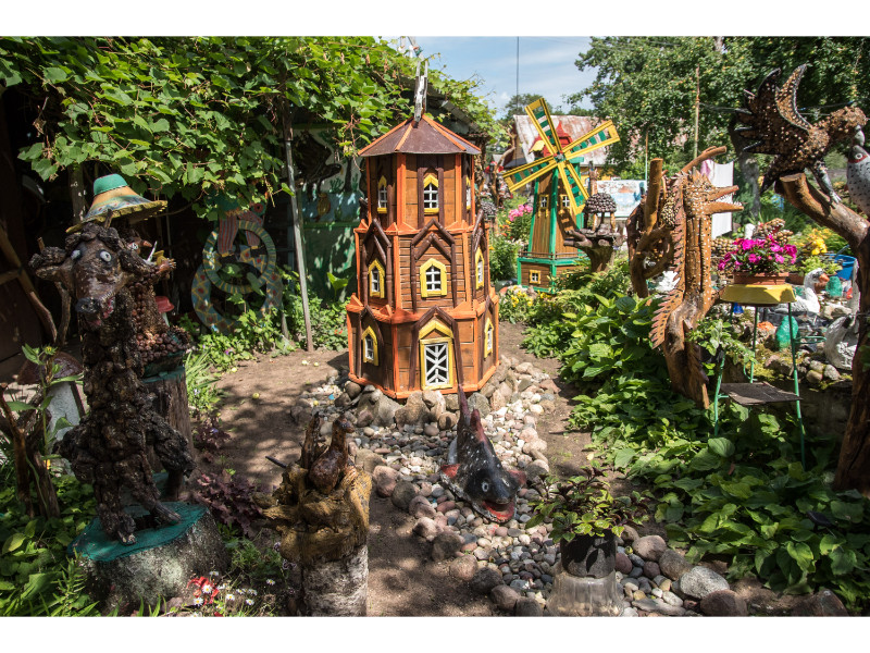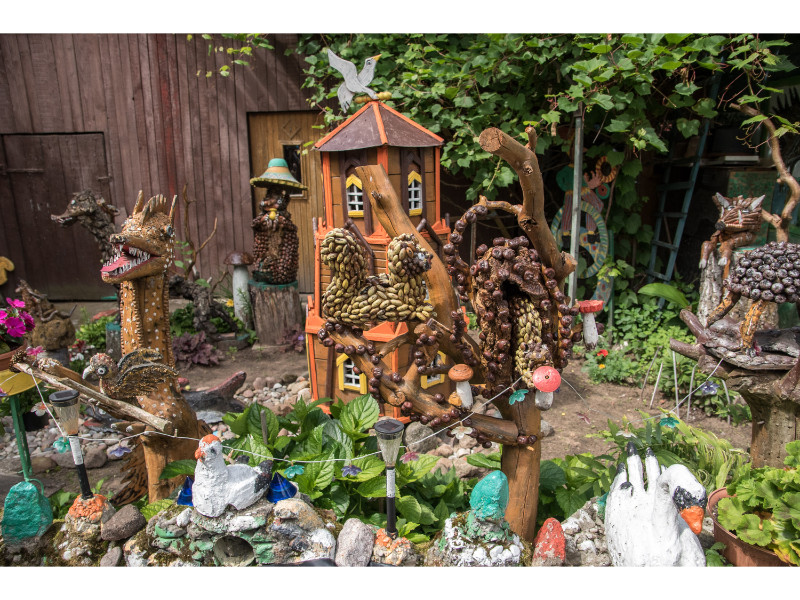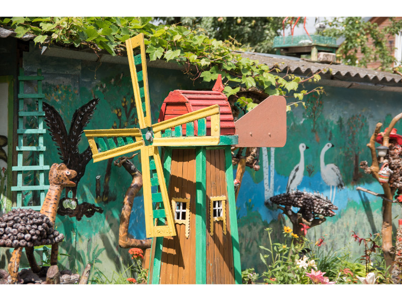 Nors panevėžietei labiausiai prie širdies kurti gyvūnų atvaizdus, sode gausu ir kitokių dirbinių: stovi aukštas iš lentų sukaltas ir puikiausiai besisukantis malūnas, stūkso ne ką menkesnė pilis.