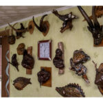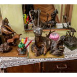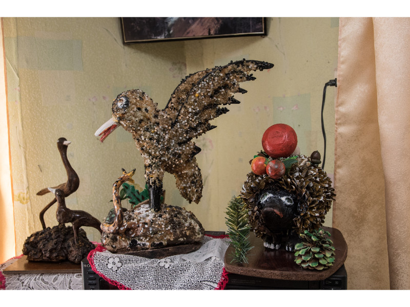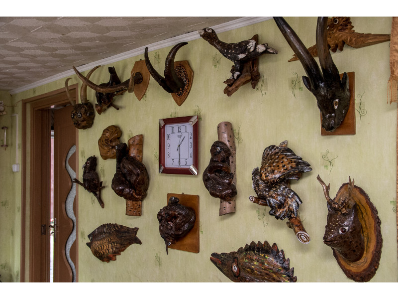A. Savickienė prisipažįsta namuose nebeturinti kur kabinti darbų, todėl juos tenka nešti į lauką. Viduje darbais išpuošti visi kampai – ant sienų kabo žuvys ir žvėrių galvos, tupi medinis ežiukas, netgi išdrožtas velnias ir kryžius.