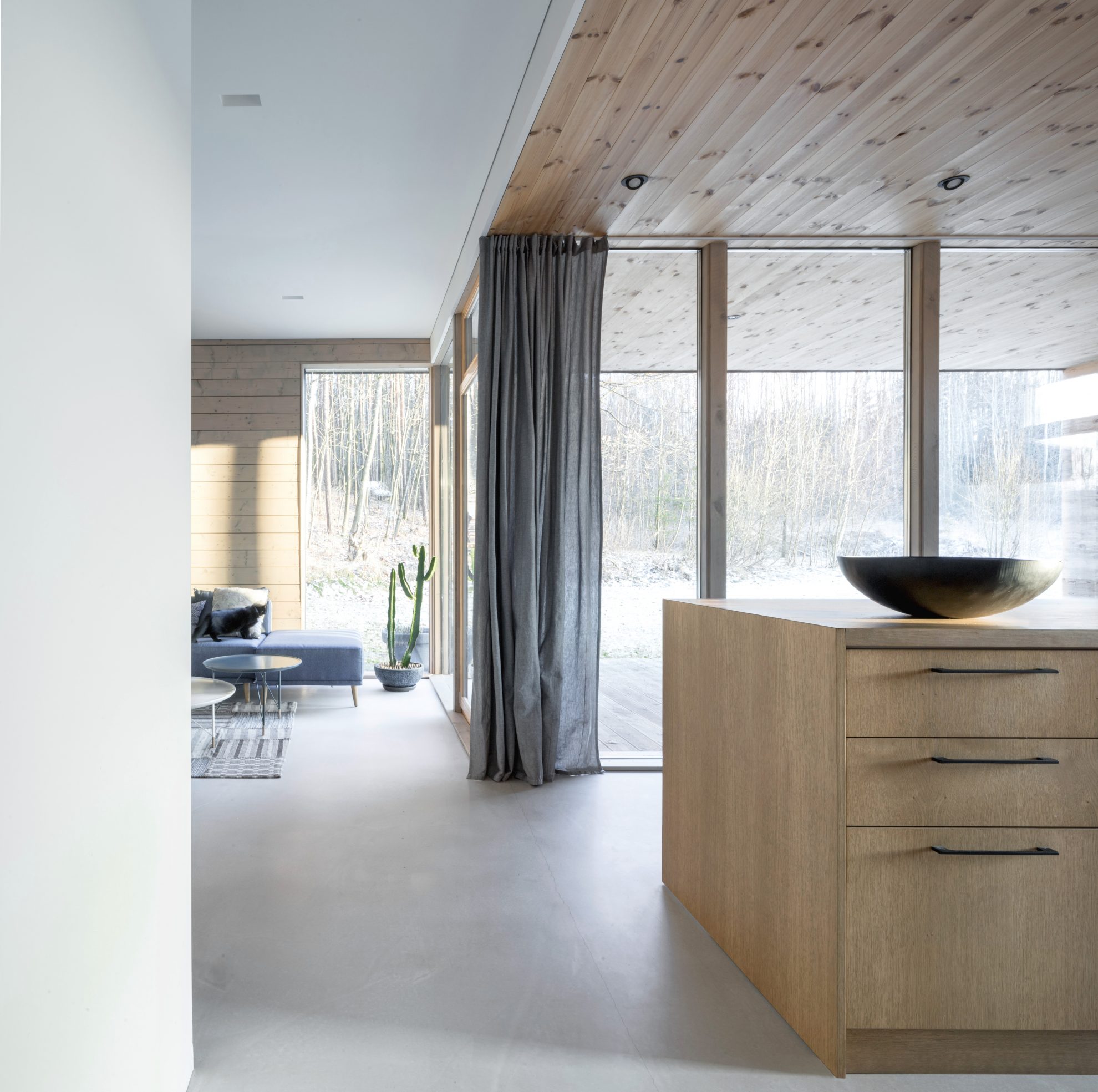 Šviesos nutviekstuose kambariuose dominuoja natūralios medžiagos, lengvi ir paprasti audiniai. Paprastumą architektas mini ne kartą – nepretenzingas interjeras malonus akiai, jame malonų ir jaukų buvimą. Ko gero, svarbiausias namų bruožas yra apgalvota medžio ir betono sąjunga, o jai sustiprėti padeda minimalistinės, detalėmis neapkrautos baltos sienos. „Kadangi namukas karkasinis, visos išorinės sienos apkaltos medžiu. Dėl temperatūros pokyčių toks statinys daugiau „juda“, dedant gipsą gali atsirasti įtrūkių“, – pasakoja architektas.