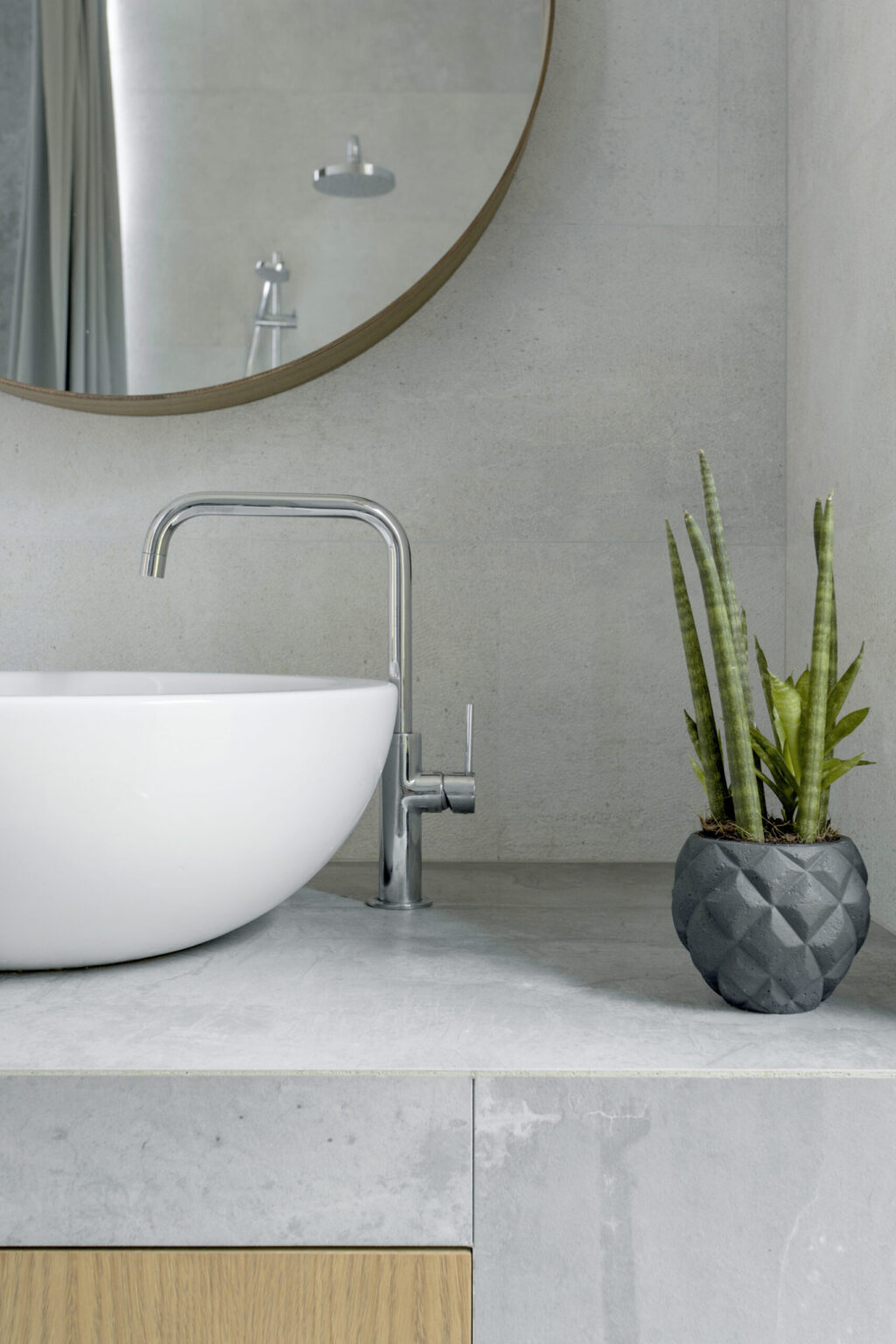 Namo sienos medinės, todėl grindims reikėjo kontrastingos, neutralios medžiagos. Betonas buvo puikus variantas. Visa kita balta – tokiame fone labai gražiai išryškėja medinės detalės, visai kitaip atrodo ir betonas. Natūralumo siekta ne tik renkantis pagrindines namo medžiagas, bet ir baldus, smulkias detales.